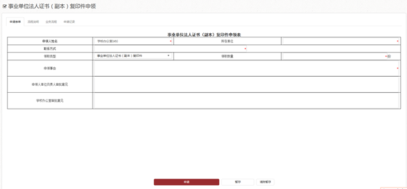 3.申领人根据需求填写《事业单位法人证书(副本)复印件申领表》,并提交申请;其中申领事由需如实填写,复印件左下方会写明“此件仅限于办理+‘申领事由’”。