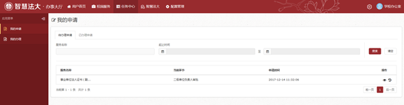 4.申领人申请后,可从“任务中心-我的申请”中查看本人申请及申请状态;申请经本单位主要负责人审批、学校办公室复核后,可凭身份证或账号密码(账号为工号,密码为身份证号后六位)前往自助打印机登陆自助打印系统,进入“预约模式打印”,进行事业单位法人证书证复印件的自助打印。