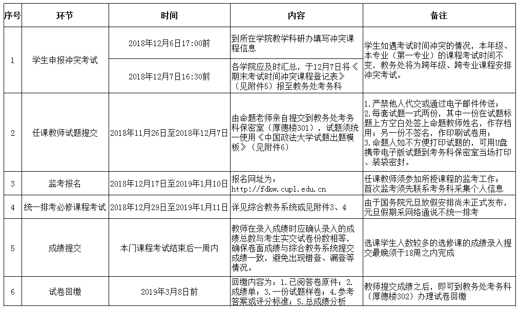 由教务处统一安排考试的必修课程,送交试题时间为:2018年11月26日-2018年12月7日。逾期未提交而导致试卷无法按时印制完成的,由命题人承担相应责任。
