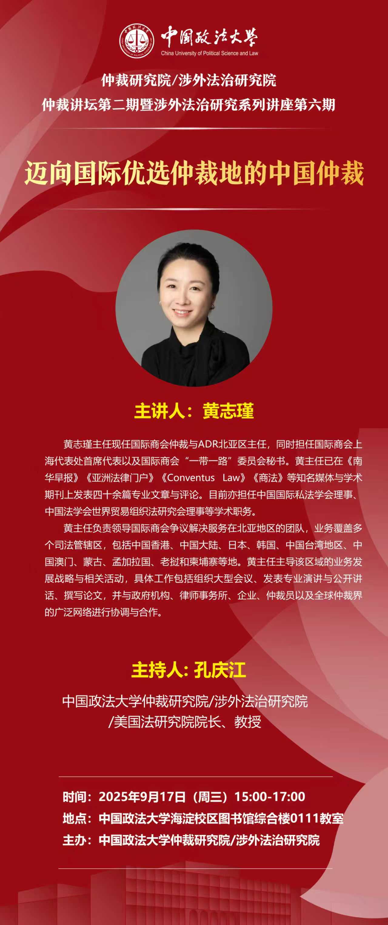 现将《迈向国际优选仲裁地的中国仲裁》讲座信息通知如下,欢迎感兴趣的师生积极参加: