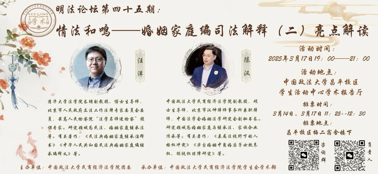 现将明法论坛第四十五期:情法和鸣--婚姻家庭编司法解释(二)亮点解读讲座安排通知如下: