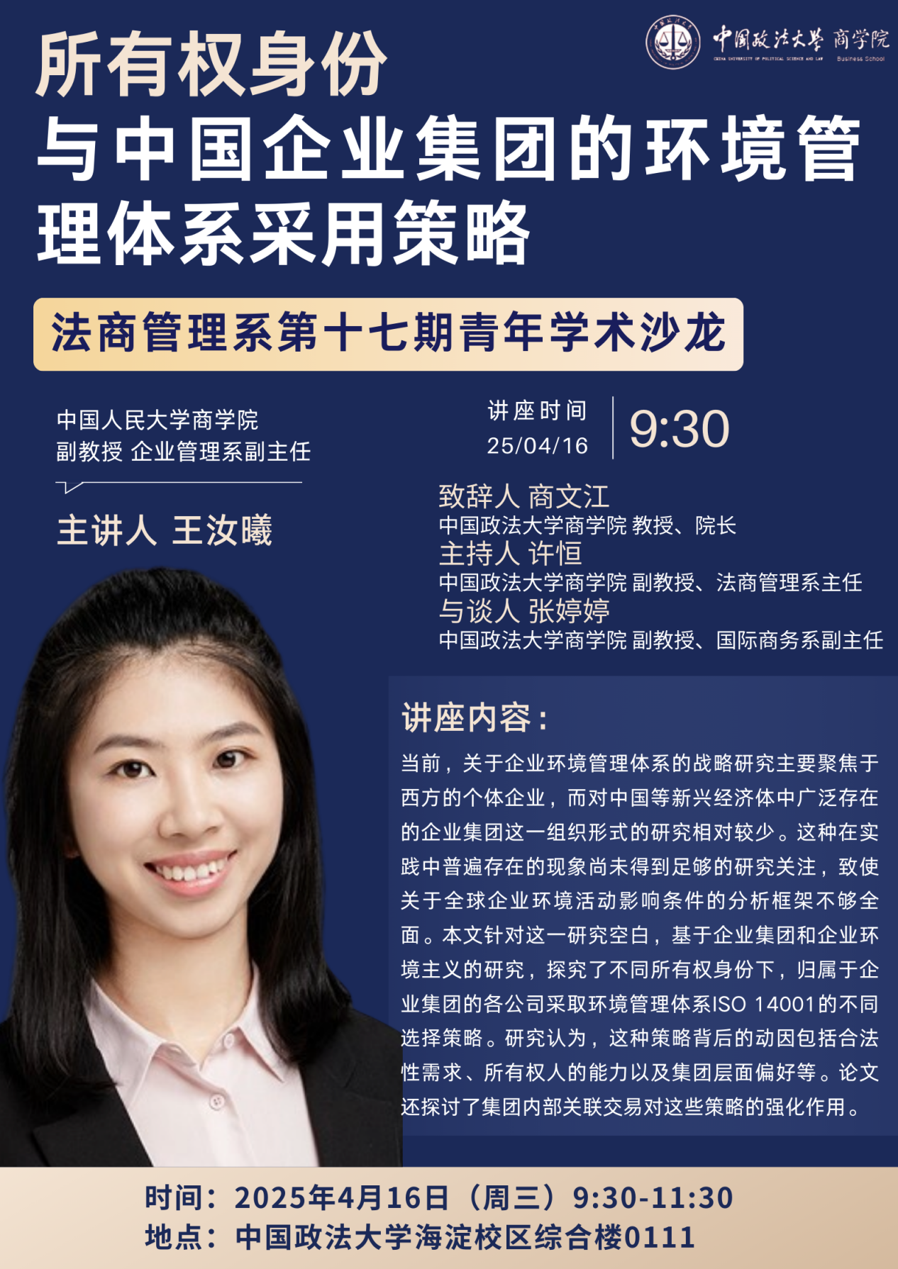 主讲人简介:王汝曦,中国人民大学商学院企业管理系副教授,荷兰鹿特丹伊拉斯姆斯大学博士。主要研究方向为企业环境战略、企业社会责任、企业创新、企业集团以及新兴市场,研究发表于管理学顶尖期刊如Strategic Management Journal, Journal of Management, Journal of Product Innovation Management, Asia Pacific Journal of Management等。