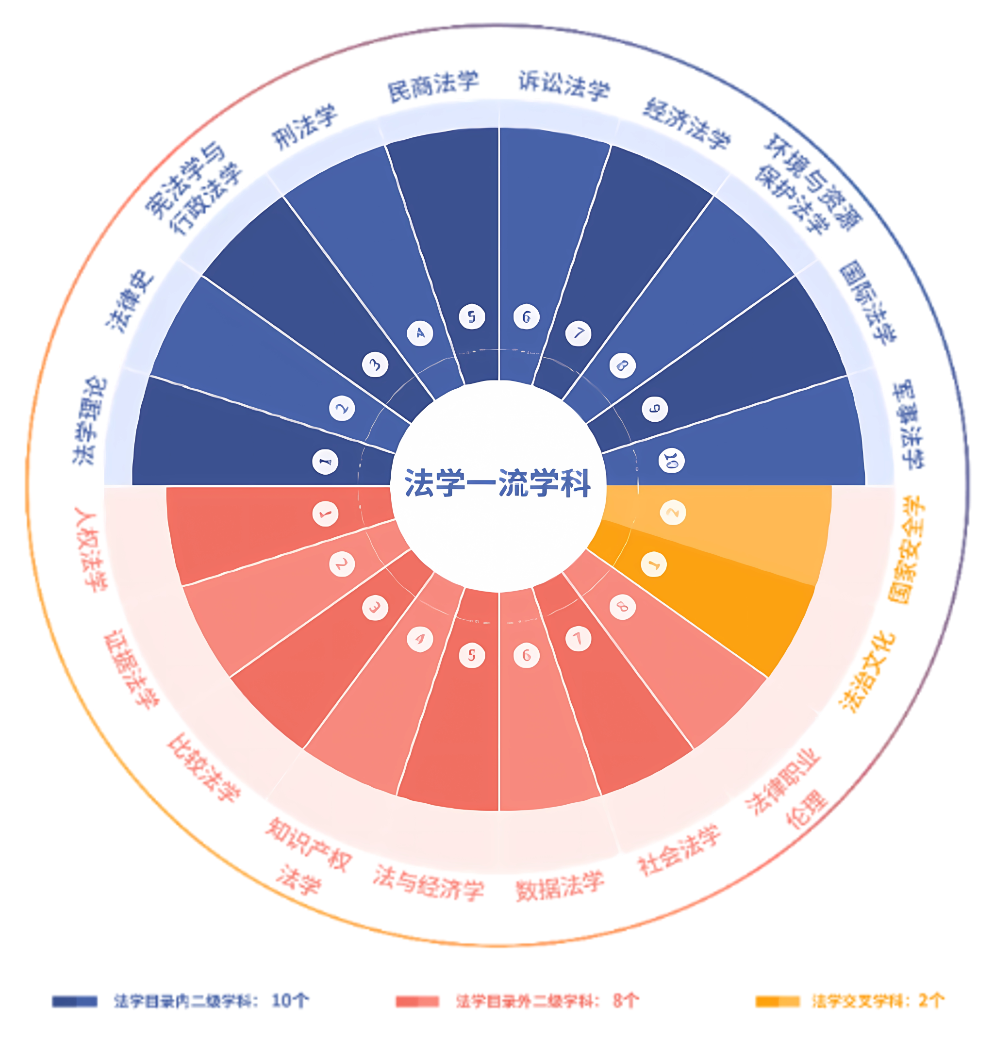 新兴交叉学科培育成效显著。健全学科动态调整优化机制,创新推进 “法工融合、文工交叉” 的 “新文科”“新法科” 建设。实施新兴学科、交叉学科两个培育与建设计划,先后遴选支持 29 个交叉学科建设项目和 18 个新兴学科建设项目,培育出法商管理、法治文化、全球学、法律职业伦理、数据法学等目录外二级学科或交叉学科,体育法学、卫生法学等研究生培养方向,形成法学持续领跑全国、多学科协同跃升、国家战略急需学科超前布局、超常规发展的学科生态格局。