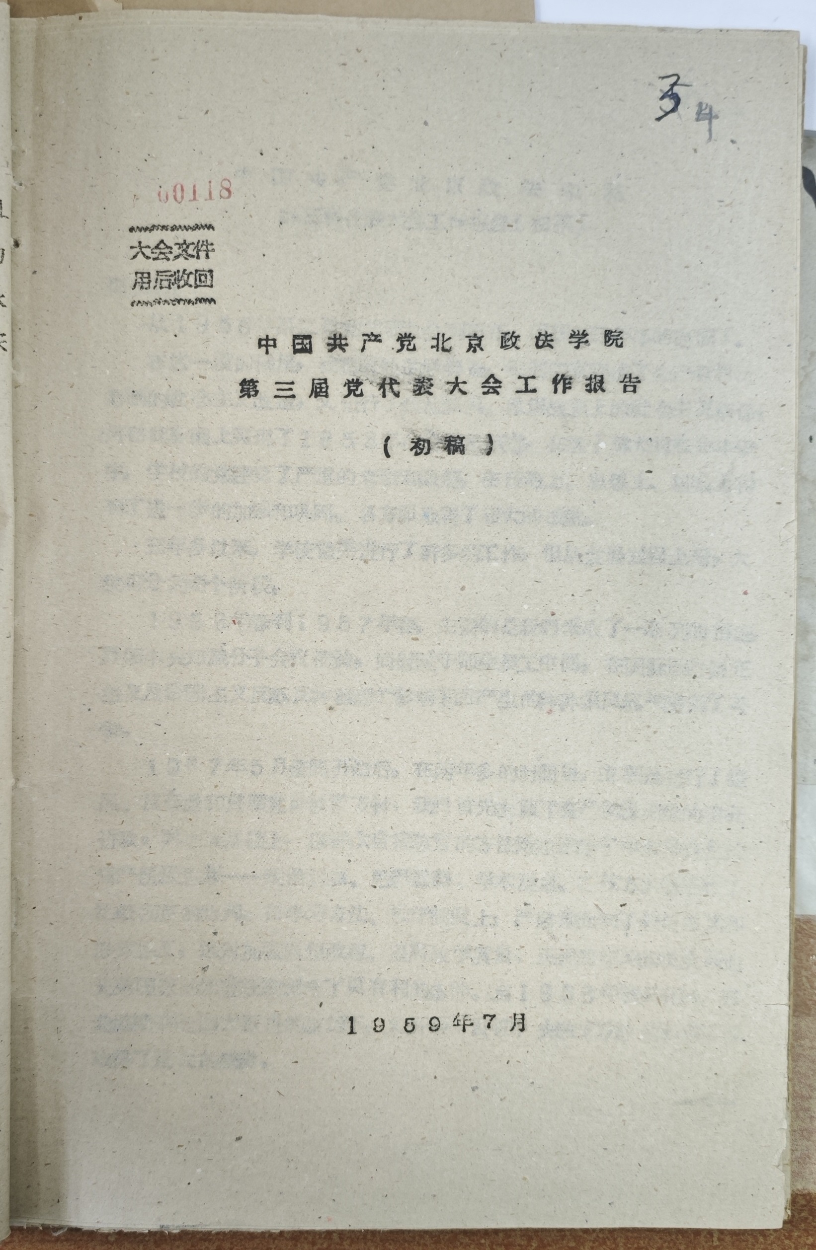 1959年7月13-18日,中国共产党北京政法学院第三次党员代表大会在学院路礼堂召开。