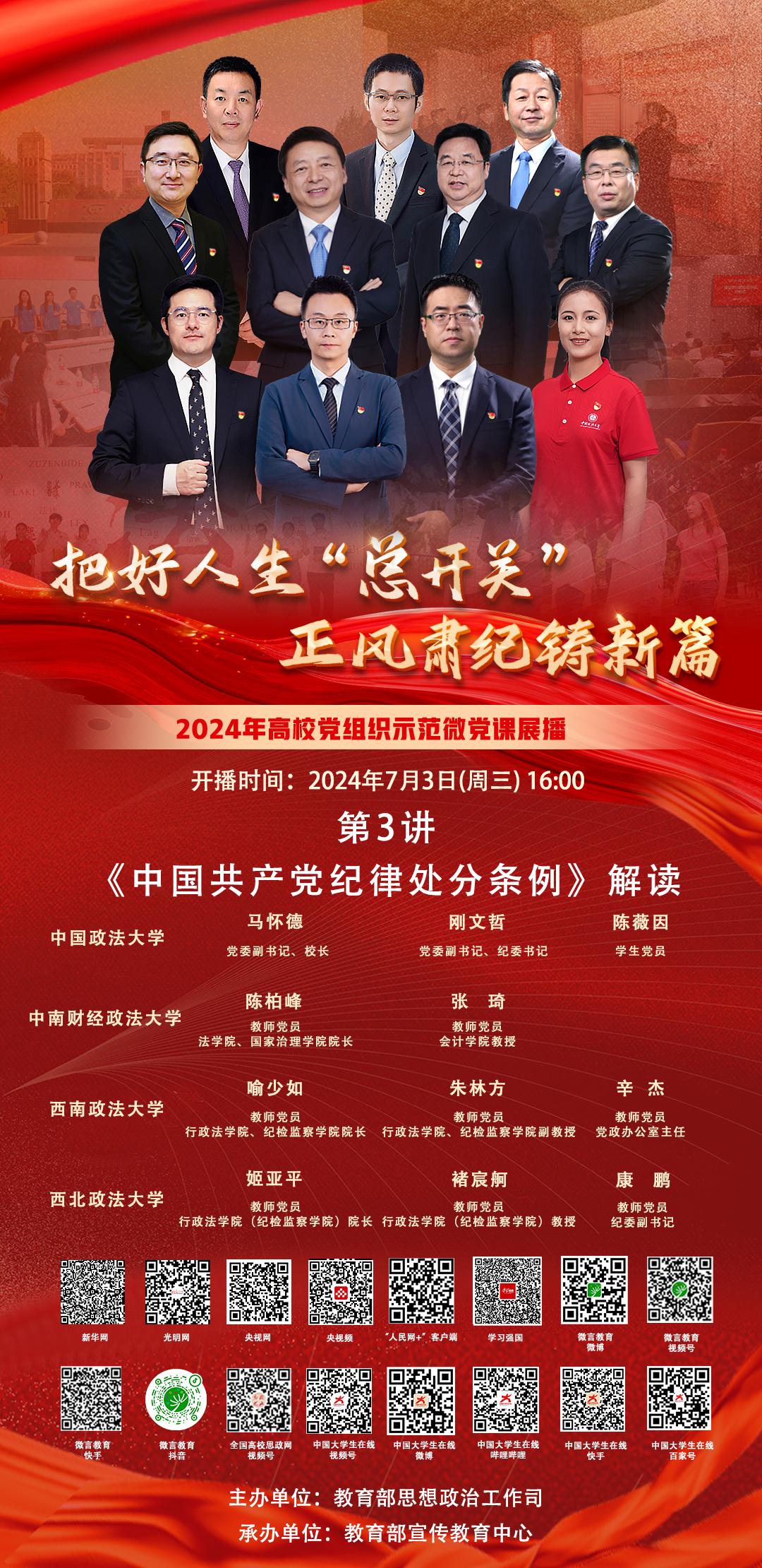 把好人生“总开关”,正风肃纪铸新篇。7月3日下午,2024年高校党组织示范微党课展播第三讲《<中国共产党纪律处分条例>解读》通过微言教育视频号、快手号、抖音号、微博...