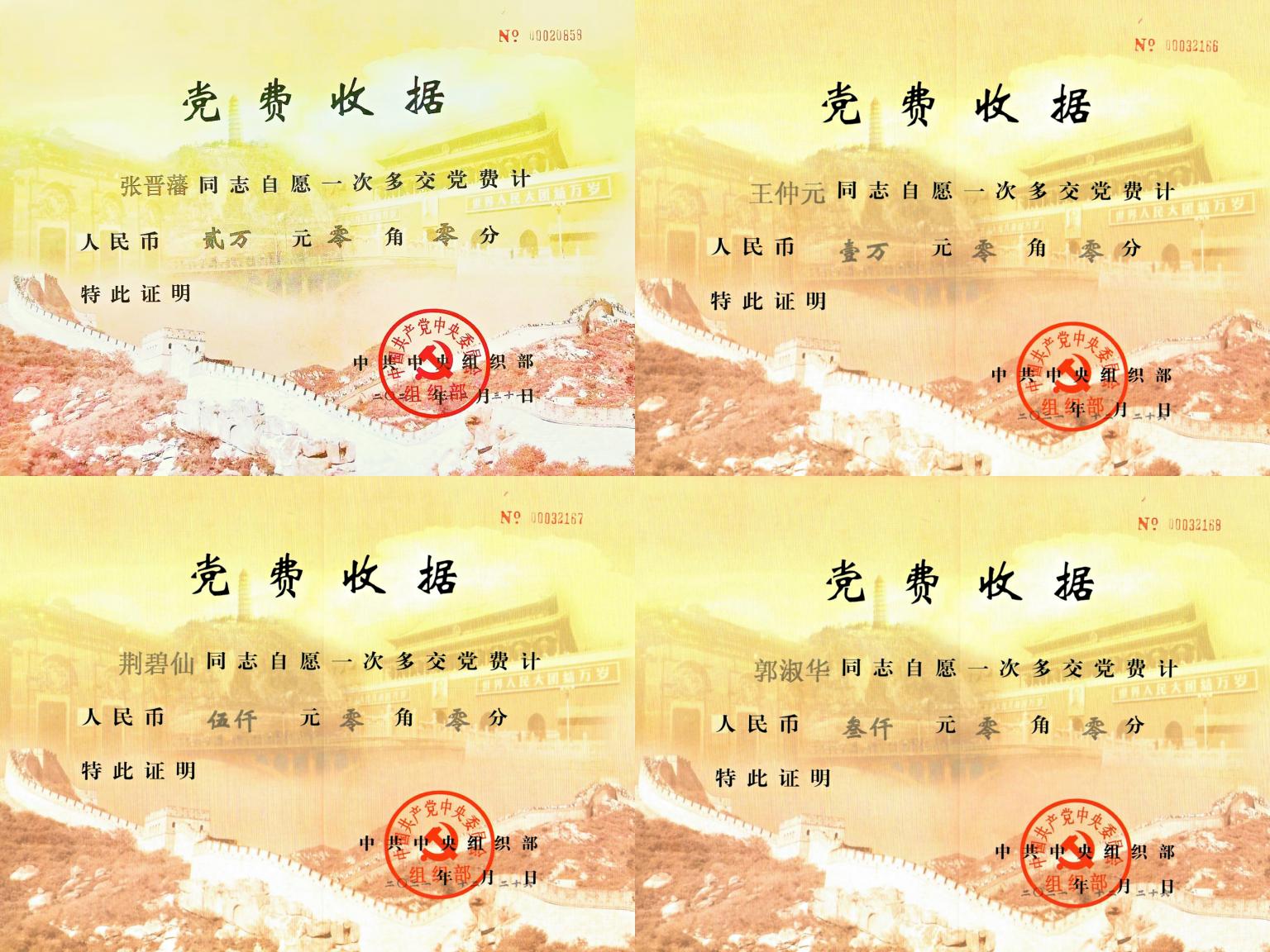 近日,我校张晋藩、王仲元、荆碧仙、郭淑华四位老党员收到中国共产党中央委员会组织部颁发的大额党费收据。四位老党员以交纳大额党费的形式,庆祝中国共产党百年华诞,...
