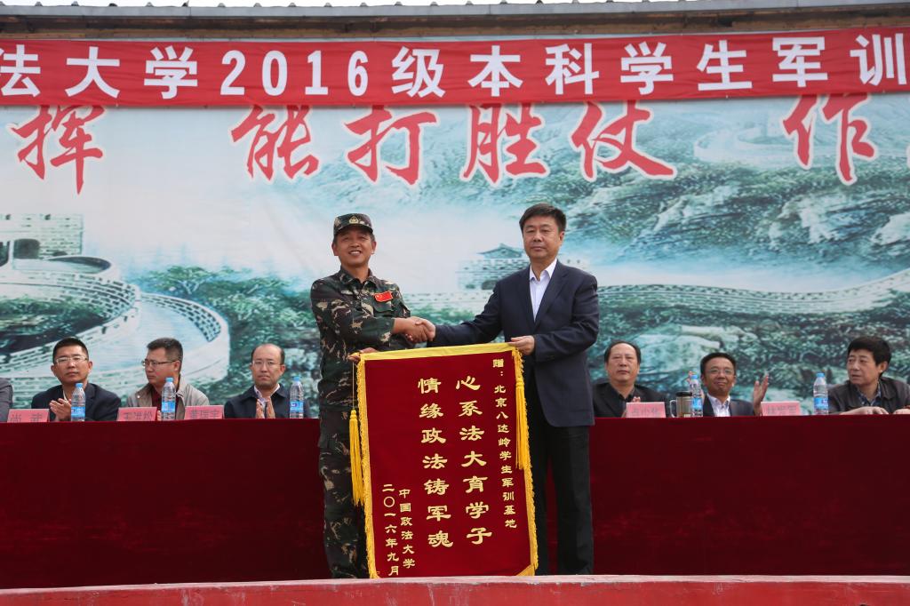 随后,胡明向基地领导赠送锦旗。他在发言中指出,军训作为法大学子入学的第一门必修课,有效提高了新生的思想素质,生活能力,执行能力,在14天的训练中,各位同学互帮互助,各个连队齐心协力,共同为训练目标努力,这一过程让来自不同院系的同学相互磨合,极大增进了新生间的友谊,也为各位同学今后四年的学习生活打下了坚实的基础。他祝愿2016级法大新生能发挥军训优良传统,成为一名合格的大学生。