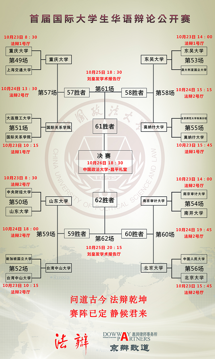 截止到24日,本届赛事的八强席位已定,分别是重庆大学、国际关系学院、东吴大学、莫纳什大学、山东大学、台湾中山大学、南京审计大学、北京大学。四强赛的四场次将于24日下午13:30起,在明法楼405—法辩2号厅依次拉开战幕。