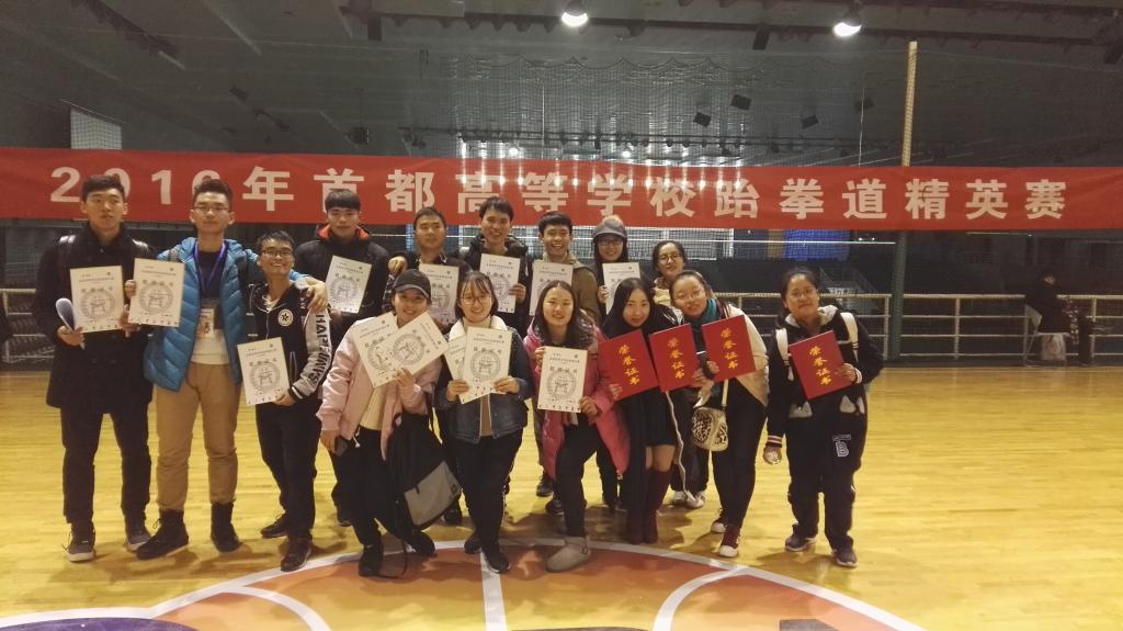 11月5日,2016年首都高等学校跆拳道精英赛在北京科技大学体育馆举行,全市十余支高校代表队共计百余名运动员参加了此次比赛。我校跆拳道队13人在领队贾海翔,教练员贾涛、赵江老师的带领下,经过激烈角逐,取得了优异的成绩。