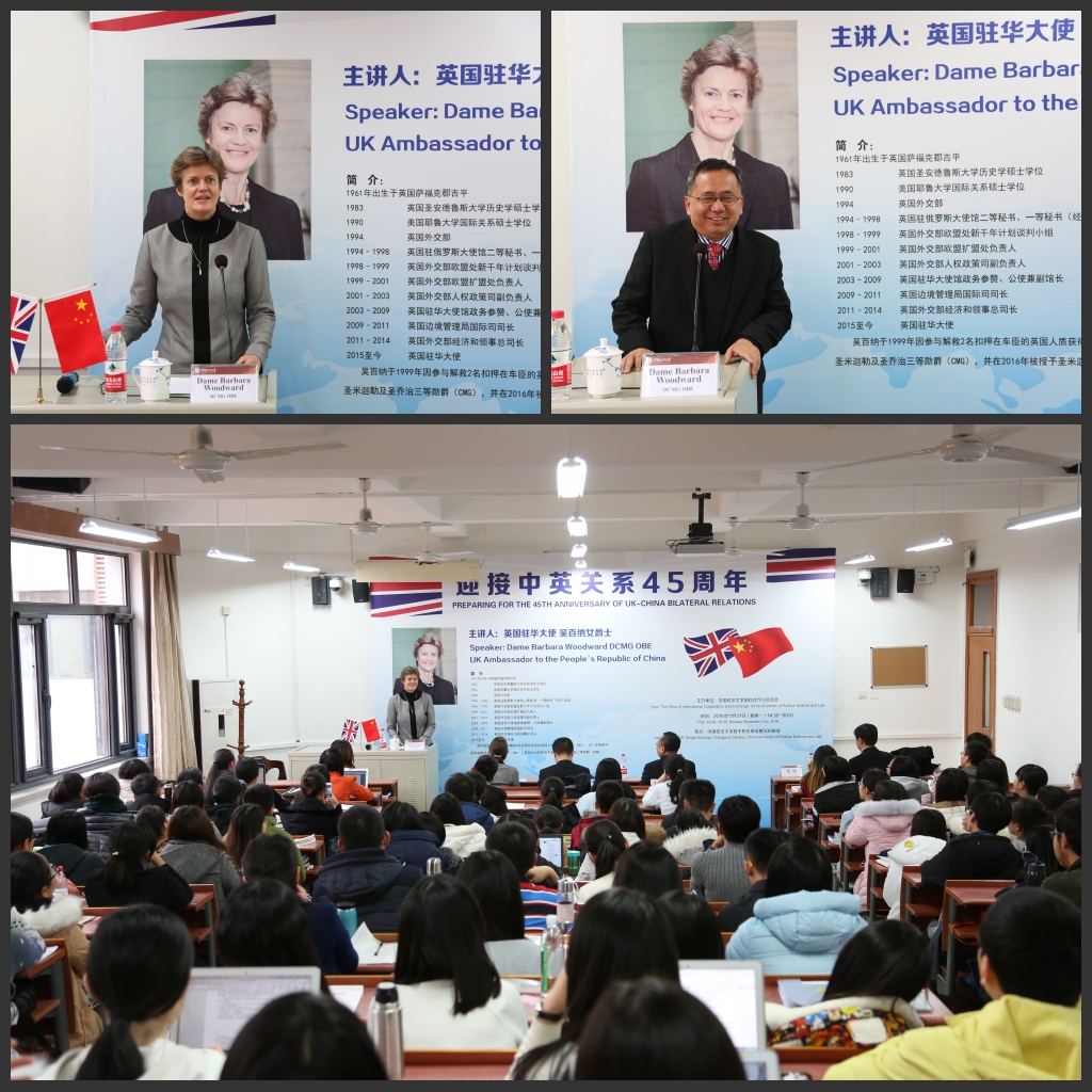会谈结束后,吴百纳为我校师生带来题为《迎接中英关系45周年》(Preparing for the 45thAnniversary of UK-China Bilateral Relations)的精彩讲座。她回顾了中英在政府、经贸、人文等领域的合作,提出了未来发展的机遇与挑战,强调如何深化、拓宽、加强双边关系。随后,我校师生就大使职能、英国脱欧、一带一路、性别平等、恐怖主义等积极提问,现场气氛热烈。讲座由学校比较法学院院长高祥主持,校学生会内事部、留学服务中心协办,吸引了约150名法大师生。