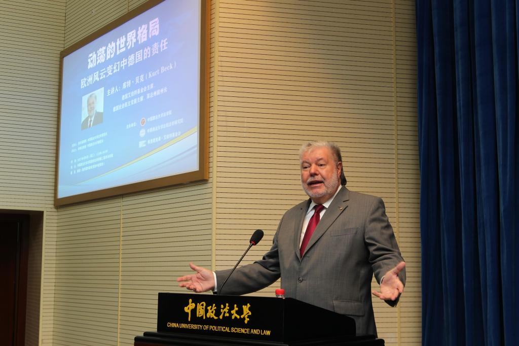 (贝克以“动荡的世界格局—欧洲风云变幻中德国的责任”为题为法大师生作讲座)