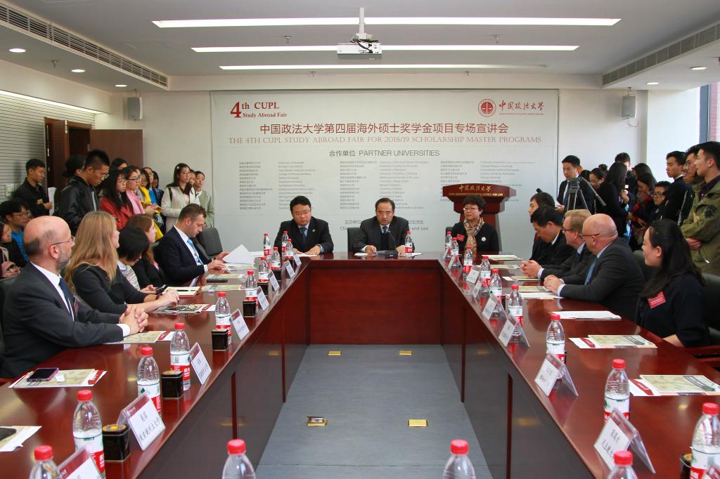 开幕式上,黄进代表学校热情欢迎海外合作院校代表们不远万里来到北京参加此次活动,并详细介绍了我校近期的办学成果,特别是国际化办学发展。黄进提到,在国家新近公布的137所 “双一流”建设高校名单中,我校成功进入全国6所“双一流”法学学科建设名单之列,又迎来了崭新的发展机遇。法大将借此良机,全面提升并深度挖掘与新老国际伙伴在优势学科、新兴交叉学科等方面的强强国际合作,通过搭建更多“法大海外硕士奖学金项目专场宣讲会”这样的良好平台,与国际优质合作伙伴全面加强人才培养、科学研究、社会服务、文化传承和国际交流。他谈到,海外硕士奖学金项目已成为法大高端国际化人才培养的重要平台之一,经过近5年的努力,合作伙伴从2013年的个位数上升到目前的52个,项目数从10个增长到66个,派出人数从原来的几十人上升到2016年的近300人;合作伙伴层次也随着一大批世界顶尖高校的陆续加入而不断提升;奖学金额度更是不断增高,外方伙伴提供从学费全免外加生活费补贴到20%-70%不等的学费减免,大大减轻了学生的经济负担;此外,项目专业也从法学逐渐扩展至政治学、国际关系、公共管理、公共政策、人文等诸多领域。黄进希望能与国际合作伙伴进一步携手合作,搭建更多平台和渠道,帮助法大学子走出国门到世界一流大学、一流专业学习深造,同时也欢迎更多合作院校的学生来法大交流和学习。