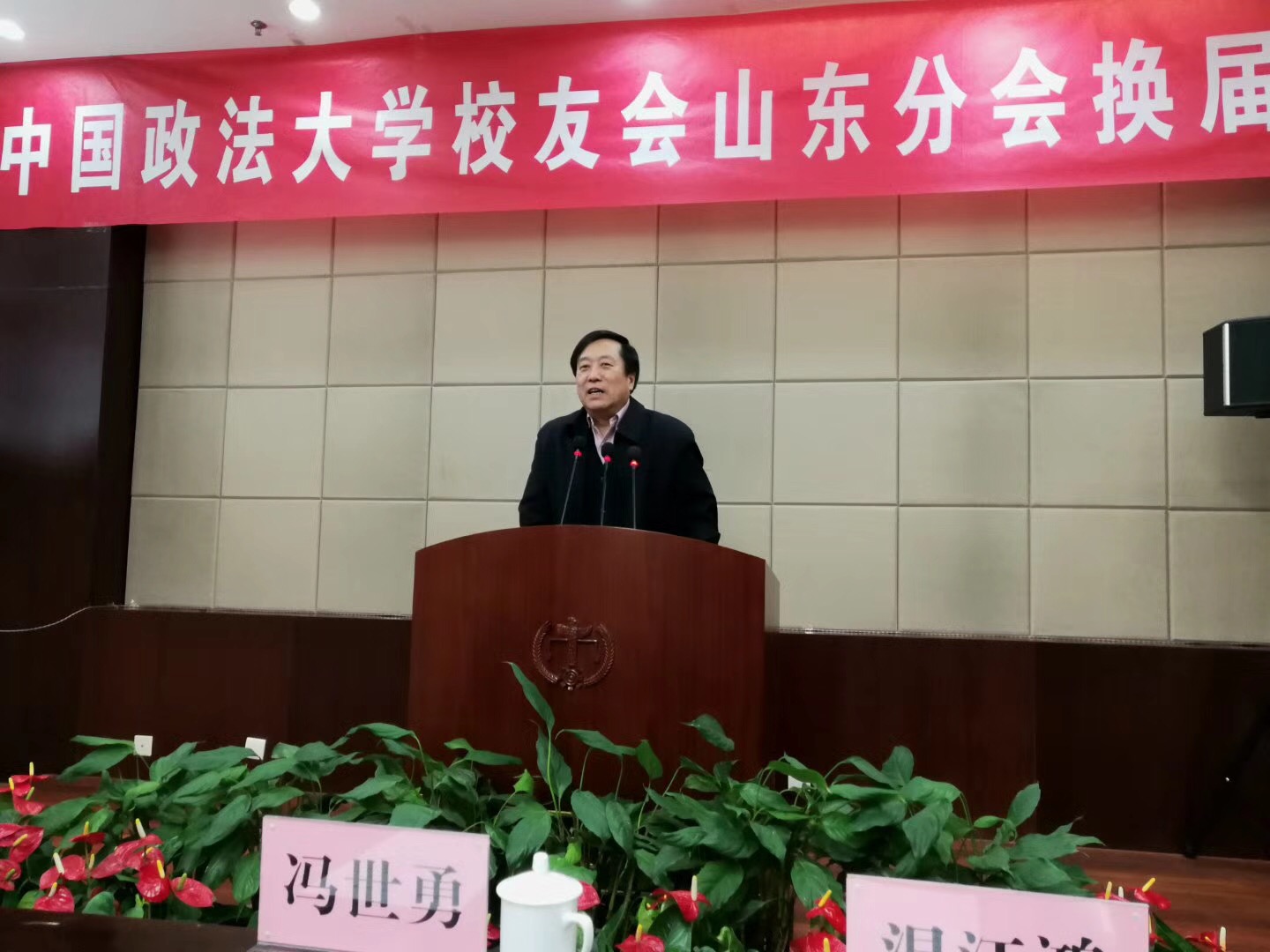 最后,冯世勇发表重要讲话。他指出,山东校友分会具有建立早、校友多、知名校友也相对较多的特点。他表示,校友是学校的名片,是学校人才培养质量的说明书,是学校的使者。校友会是团结、凝聚校友的组织,是桥梁和纽带,是校友的家园和驿站。校友会的功能最突出的是服务校友、服务母校和服务社会。接着,他指出2017年学校通过了本科教学评估、习近平总书记视察法大、通过“双一流”建设、第八次党代会召开等大事喜事多,是法大光辉历史上浓墨重彩的一笔。