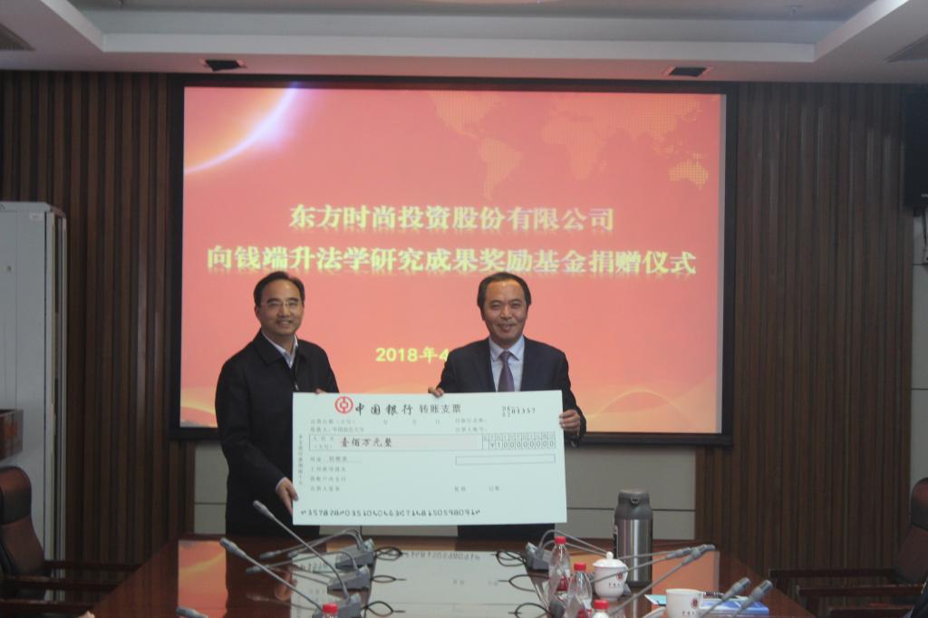 为支持钱端升法学研究成果奖评奖活动,东方时尚投资股份有限公司再次向钱端升法学研究成果奖励基金捐赠100万元。黄进代表钱端升法学研究成果奖励基金理事会接受捐赠,并向闫文辉颁发了捐赠证书,感谢东方时尚投资股份有限公司为支持钱端升法学研究成果奖评奖活动做出的贡献。