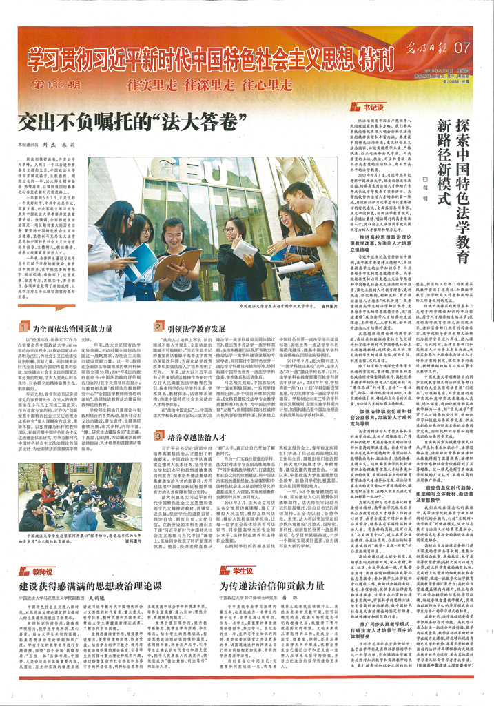 2018年5月3日,在习近平总书记考察2026美加墨世界杯比赛时间一周年这样一个特殊的日子里,《光明日报》第七版“学习贯彻习近平新时代中国特色社会主义思想特刊”,以整版的篇幅对我校贯彻落实习近平总书记考察法大重要讲话精神一年来取得的成果进行了报道。