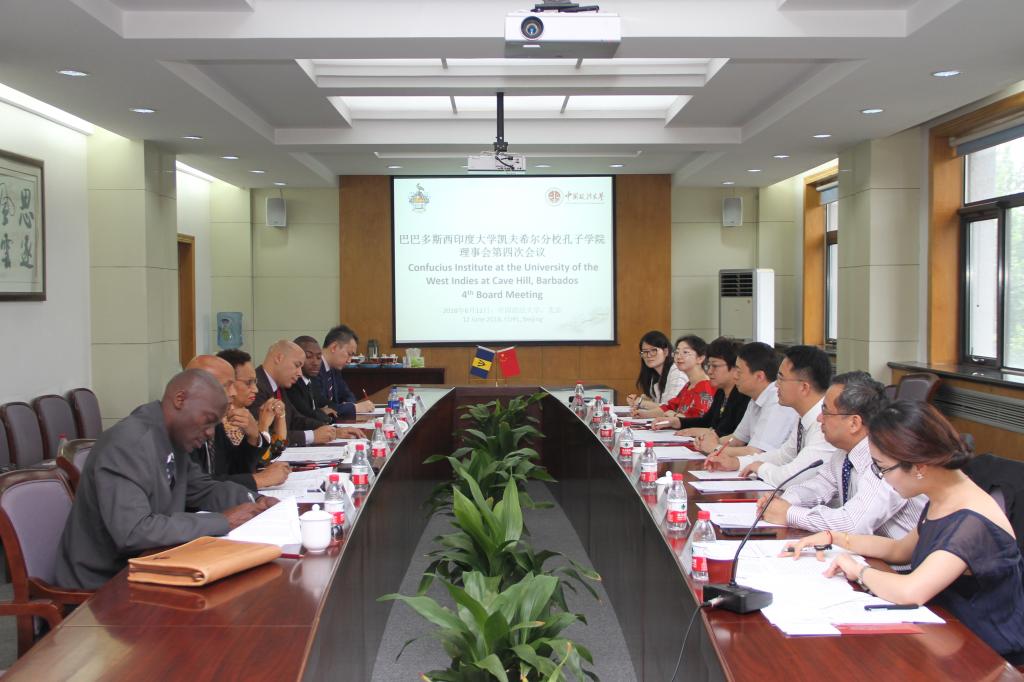 6月12日下午,我校共建巴巴多斯西印度大学凯夫希尔分校孔子学院第四届理事会会议在昌平校区召开。西印度大学凯夫希尔分校校长Eudine Barriteau、孔子学院外方院长David Bulbulia、亚瑟•路易斯爵士社会与经济研究所主任Don Marshall、法学院副院长Westmin James、我校副校长马怀德、孔子学院中方院长宋庆宝、比较法学研究院院长高祥、国际合作与交流处处长许兰等出席会议。巴巴多斯驻华大使Francois Jackman、国家汉办美大孔子学院处项目官员商若凡作为特邀嘉宾列席理事会。会议由许兰主持。
