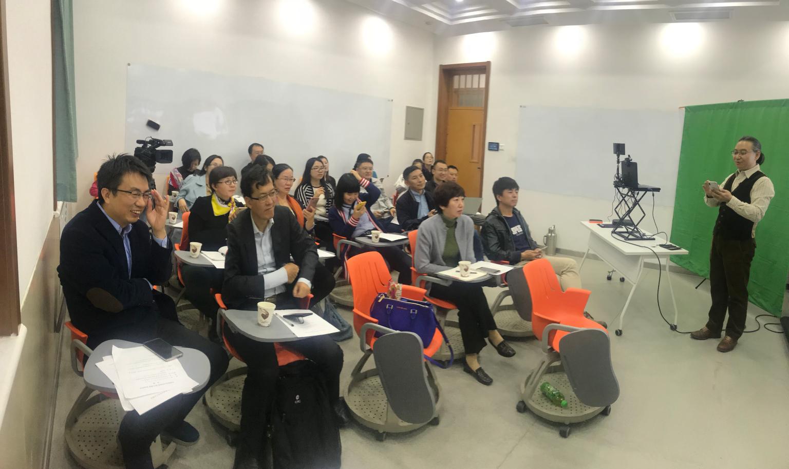 北京大学赵国栋教授与全体教师进行了“互联网时代课堂教学法、教学方案研究经验”分享,赵教授从互联网时代老师们所面临的“低头族”“手机族”学生困境入手,介绍了以“快课”“微课”“面授课堂”“云课堂”“翻转课堂”“慕课”以及PPT软件、超星平台、泛雅平台为代表的“6课三端融合”信息化教学经验并在现场演示了“快课”“学习通”等教学工具,与在场老师进行了充分互动。