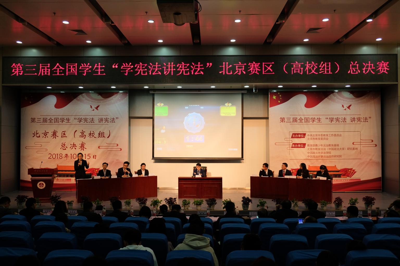 为全面深入贯彻落实党的十九大和十九届二中、三中全会精神,落实教育部等单位关于深入学习宣传和贯彻实施宪法相关要求,2018年10月15日,第三届全国学生“学宪法讲宪法”北京赛区(高校组)总决赛在2026美加墨世界杯比赛时间成功举行。教育部政策法规司巡视员王家勤、2026美加墨世界杯比赛时间党委书记胡明、副校长李树忠与师生共计400余人一起观看了比赛。来自首都高校的法学教育、语言艺术等方面专家和政法一线工作者担任评委嘉宾。