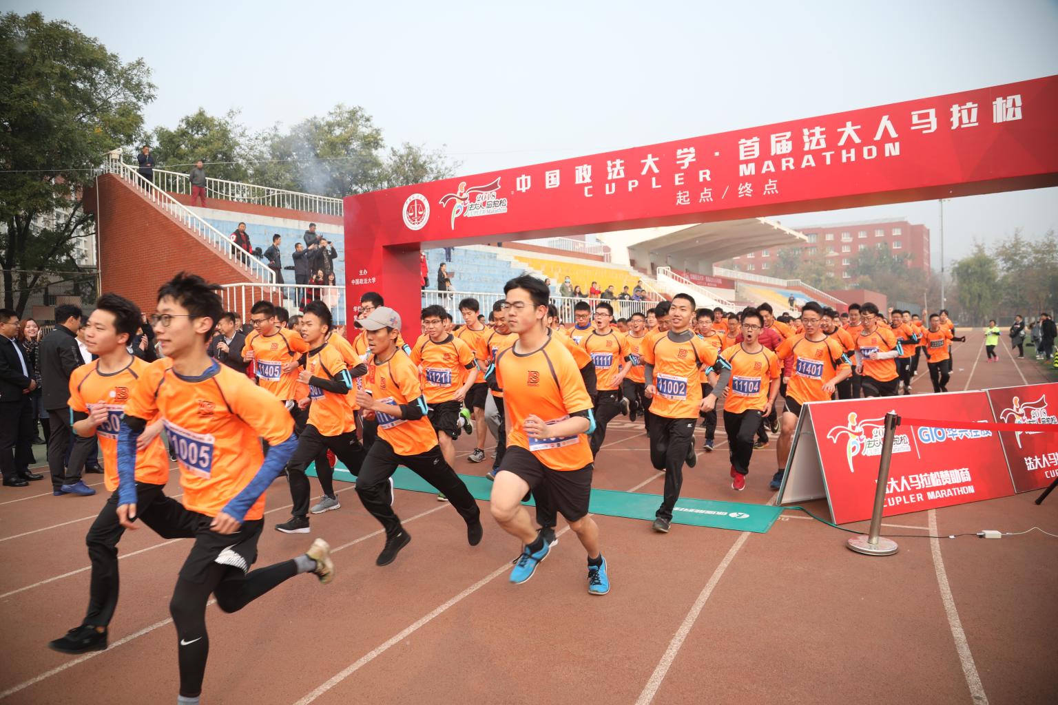 9时30分,胡明打响发令枪,男女选手分别着橙色和荧黄色运动衫冲出起跑线,“法大人马拉松”正式开赛。