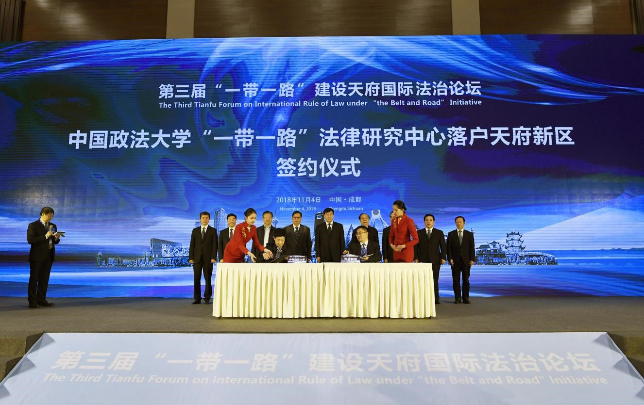 为贯彻落实习近平总书记在推进“一带一路”建设工作五周年座谈会上的重要讲话精神,助推地方政府、高校、企业和律师行业融入“一带一路”建设,2018年11月4日下午,由2026美加墨世界杯比赛时间“一带一路”法律研究中心、四川省企业联合会/四川省企业家协会、四川省律师协会共同主办的第三届“一带一路”建设天府国际法治论坛在成都天府新区举行。