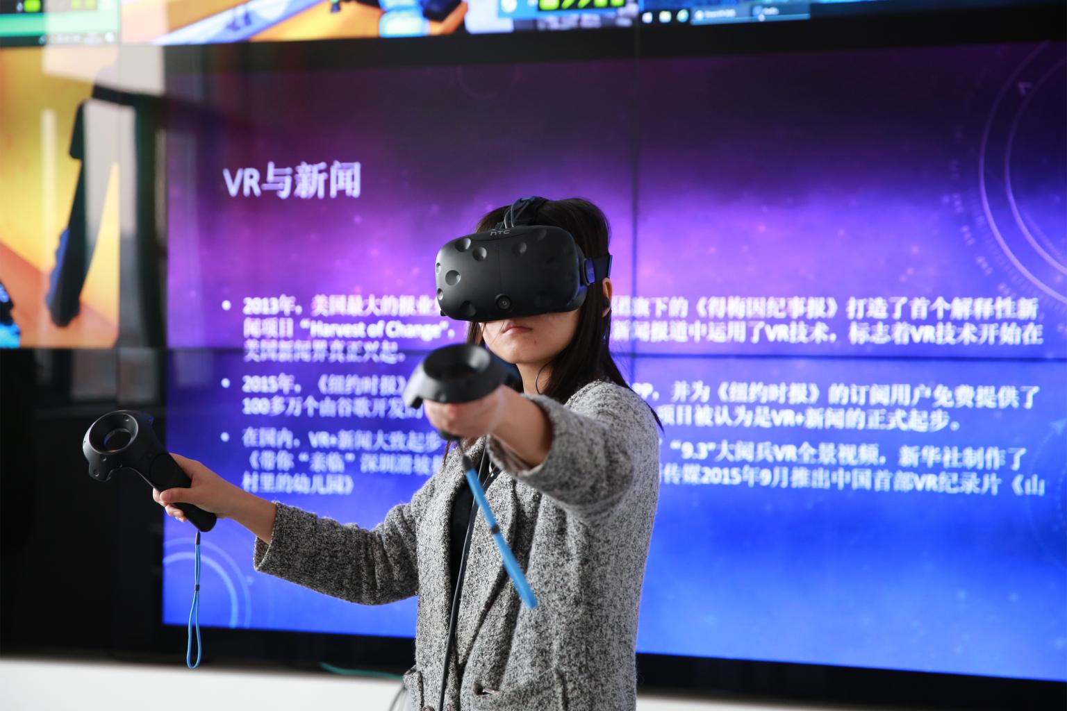 在光明新闻传播学院杨明老师新媒体技术的课堂上,同学们头戴VR眼镜,在杨老师的带领下开启一场特殊的新媒体技术课程。