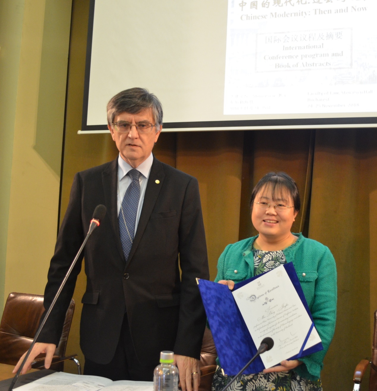 当地时间11月24日上午,在“中国的现代化:过去与现在”国际会议暨我校共建布加勒斯特大学孔子学院五周年院庆开幕仪式上,布加勒斯特大学校长米尔恰·杜米特鲁(Mircea Dumitru)为布大孔院中方院长董京波颁发“布加勒斯特大学汉语教学和中华文化传播杰出贡献奖”,以表彰她为布大孔院、尤其是汉语教学和中华文化在罗马尼亚的传播所做出的贡献。