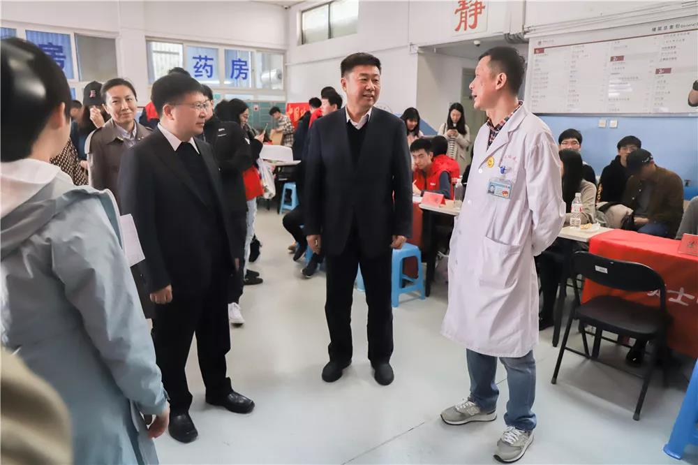(胡明、常保国及相关部门负责人慰问参加献血活动的同学和工作人员 李泽峰 摄)