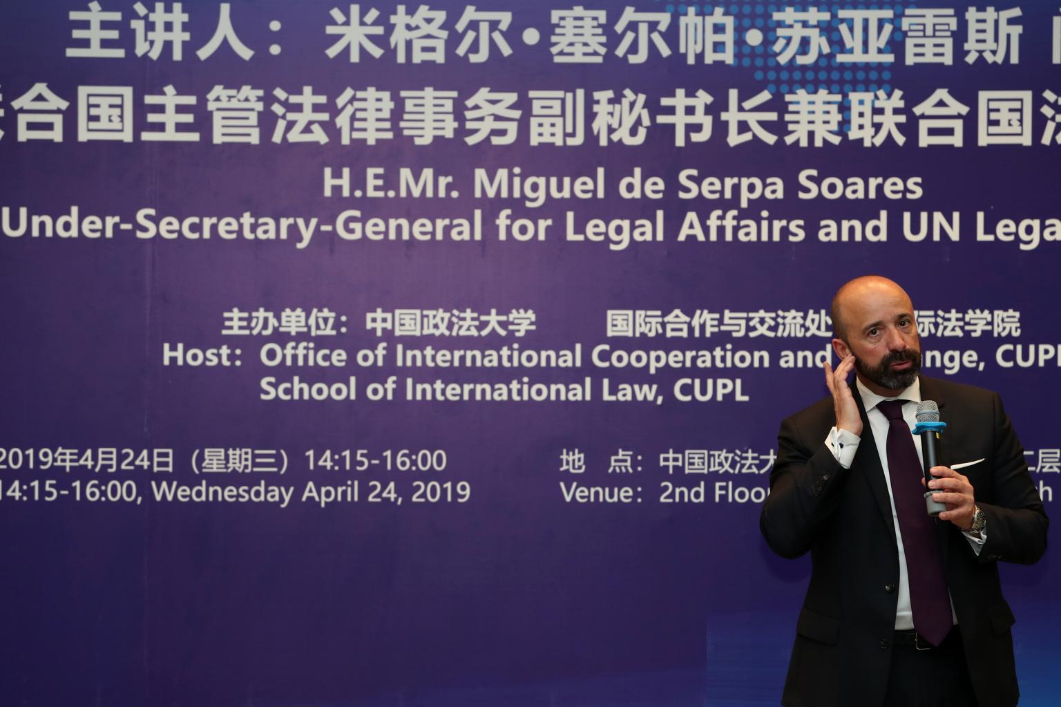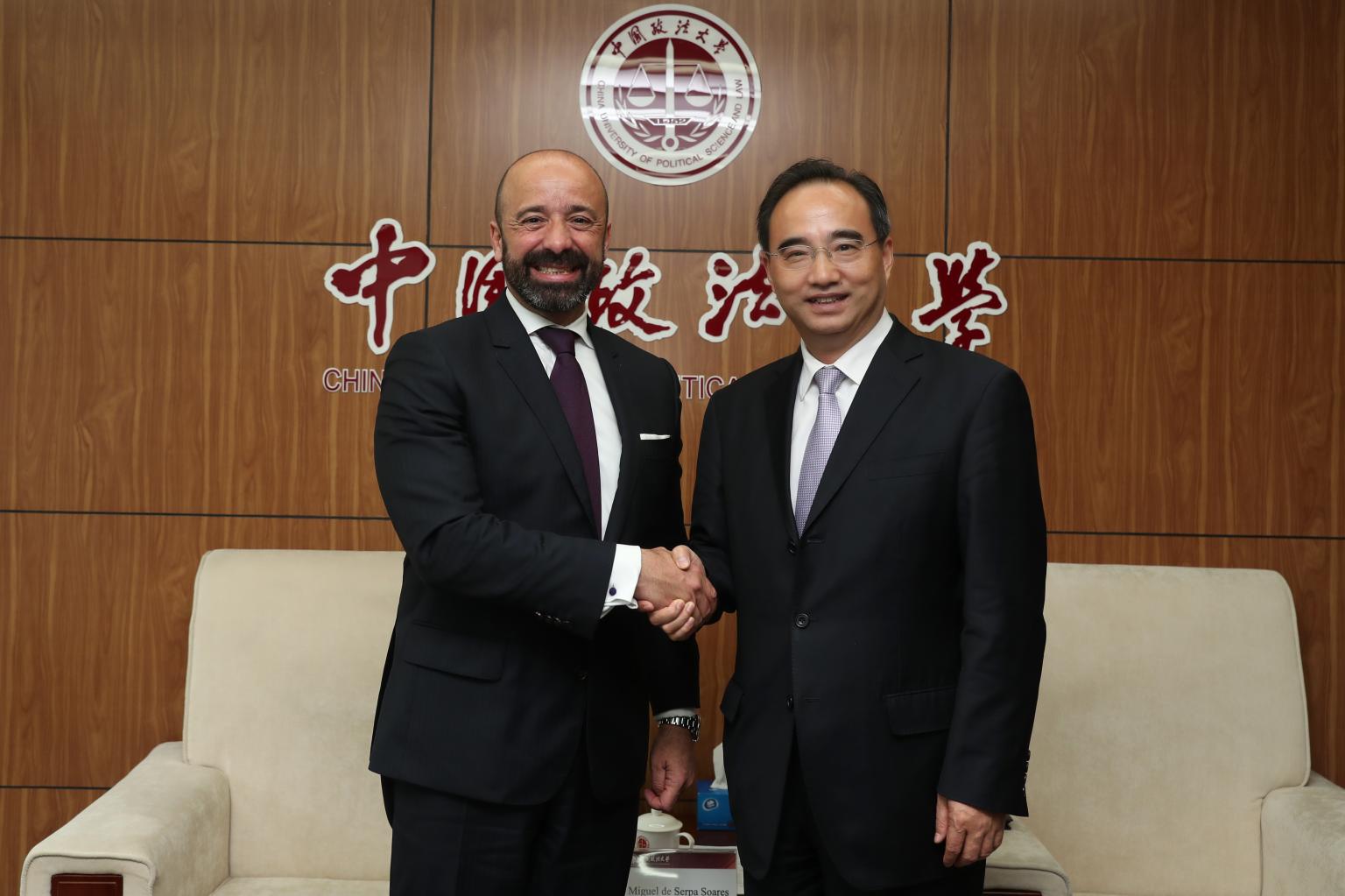 2019年4月24日下午,校长黄进在我校学院路校区亲切会见联合国主管法律事务副秘书长兼法律顾问米格尔·塞尔帕·苏亚雷斯(Miguel de Serpa Soares)一行。
