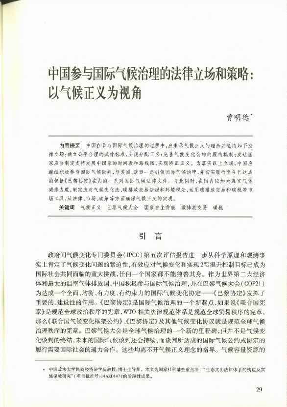 中国参与国际气候治理的法律立场和策略:以气候正义为视角 曹明德
