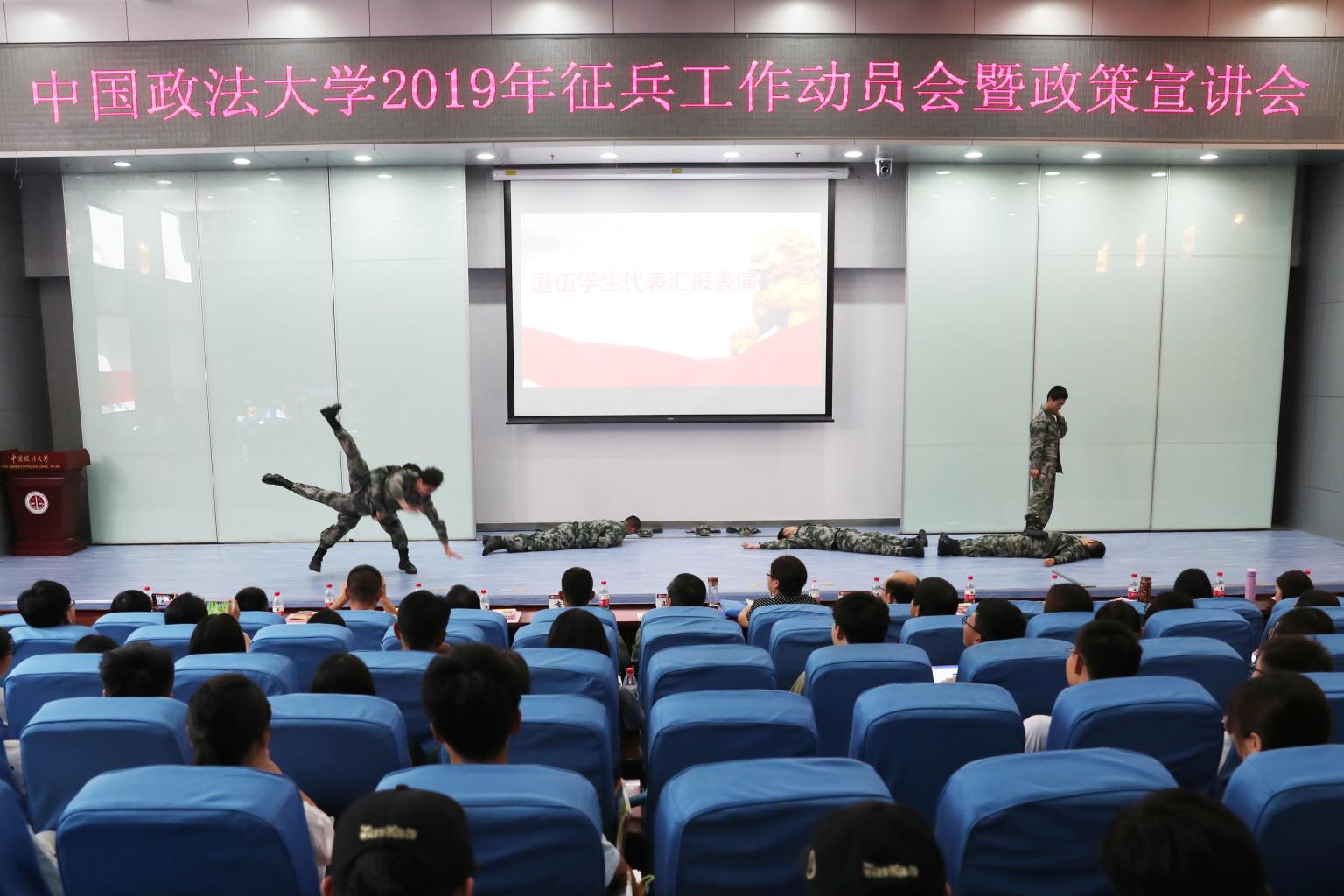 会议伊始,播放了我校征兵宣传片《我们的荣耀青春》和第十二届“感动法大”人物、退伍学生马壮的先进事迹视频。退伍学生代表汇报表演擒拿格斗综合演练和班组战斗演练,展现了我校大学生士兵的风采,精彩的演出赢得了在场师生的热烈掌声。退伍学生代表张钊、李伟先后发言,“我是一个兵,永远在突击”、“穿军装的青春最精彩”,他们从思想境界的提升、意志品质的磨炼、身体素质的增强、综合能力的提高等方面总结了在军营中的成长收获。
