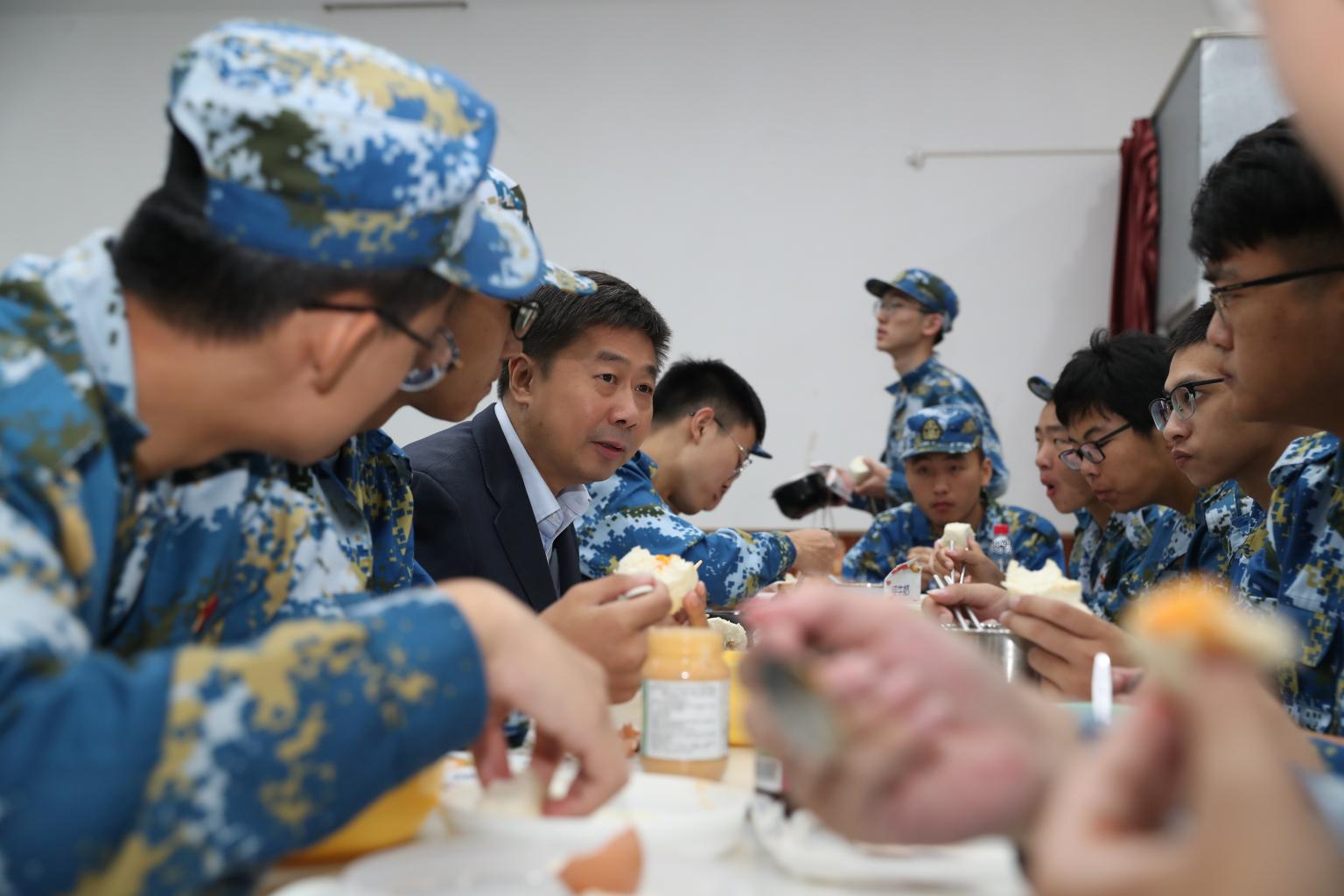 抵达基地后,胡明一行首先来到人才培训中心食堂与同学们共进早餐。期间胡明与同学们亲切交流,了解同学们在军训基地训练生活状况,倾听他们训练生活的点点滴滴。随后,胡明一行来到2019级学生军训团指挥部,深入了解工作生活环境,并向驻训辅导员、校医、保卫和学工老师们表示慰问。