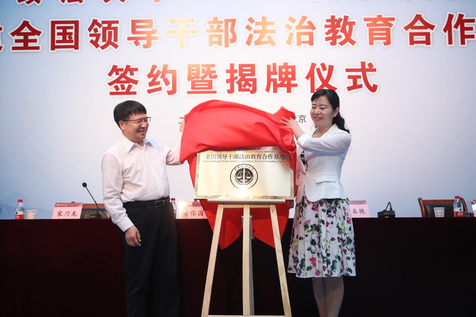 (常保国与李春燕为全国领导干部法治教育合作基地揭牌 尹建峰 摄)
