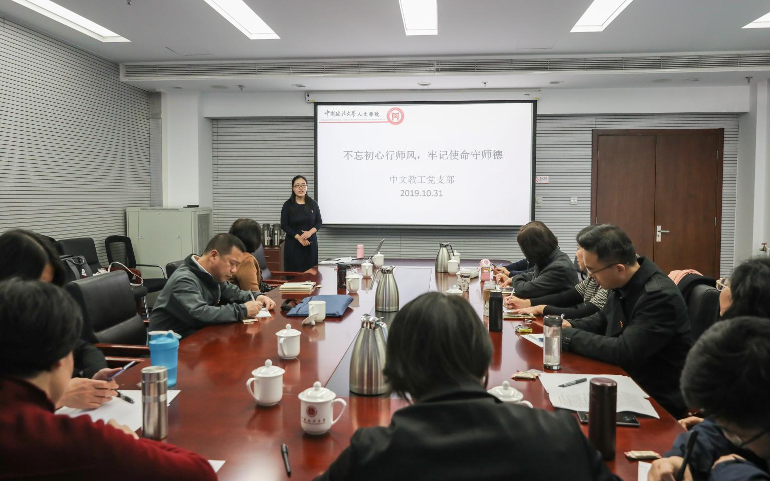 人文学院中文教研室党支部书记张文从师德师风建设的重大意义、内涵和建设要求这三方面,与支部党员交流学习感受。“在党的十九大报告中,习近平总书记再次强调要全面贯彻党的教育方针,高度重视师风建设问题。高校的立身之本在于立德树人,而高校教师只有加强自身的德风建设,才能做好树人工作。”她表示,要落实立德树人这一教育工作的根本任务和中心环节,慎微自律,行为世范,牢记初心和使命,加强自身德风建设。