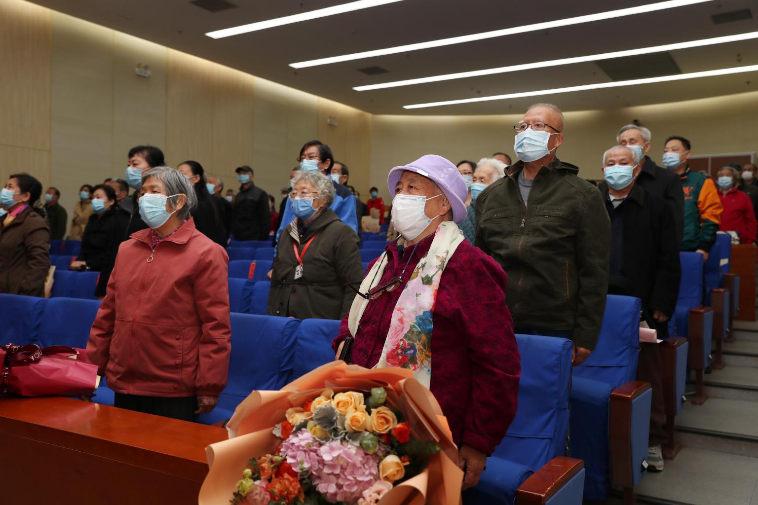高浣月宣读了80岁、90岁寿星名单,校领导向80、90岁的老同志祝贺并为他们献上鲜花表达祝福。