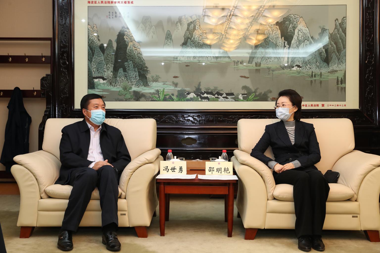 11月17日上午,我校副校长、校友总会会长冯世勇一行访问北京市海淀区人民法院。北京市海淀区人民法院党组书记、院长邵明艳,党组成员、政治部主任戴国出席座谈会。