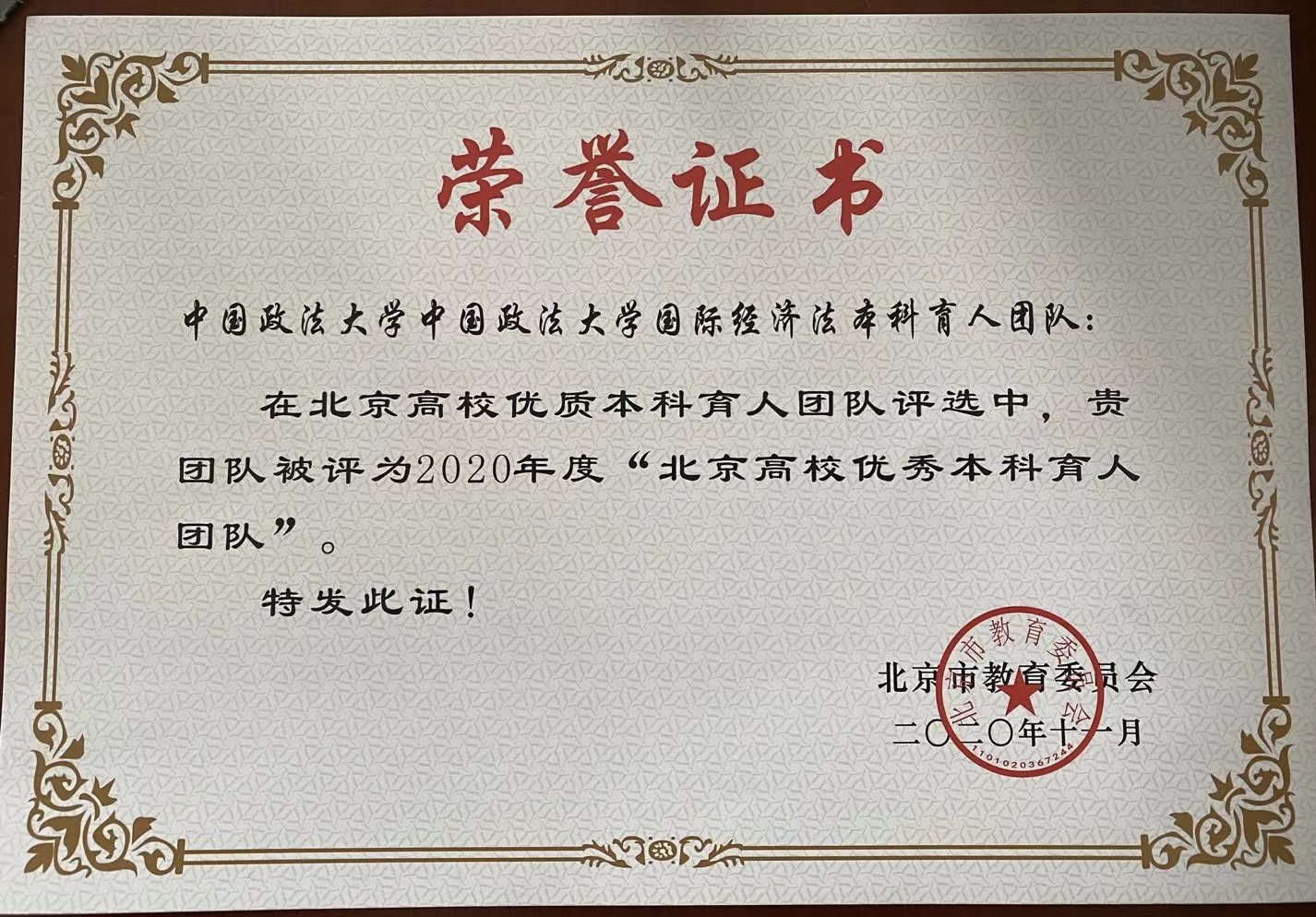 (记者 王安琪)近日,北京市教育委员会发布了《关于公布2020年“北京高校优秀本科育人团队”和“北京高校优秀本科教学管理人员”评选结果的通知》(京教函〔2020〕508号),我校国际法学院孔庆江教授为带头人的国际经济法本科育人团队获评“北京高校优秀本科育人团队”荣誉称号。