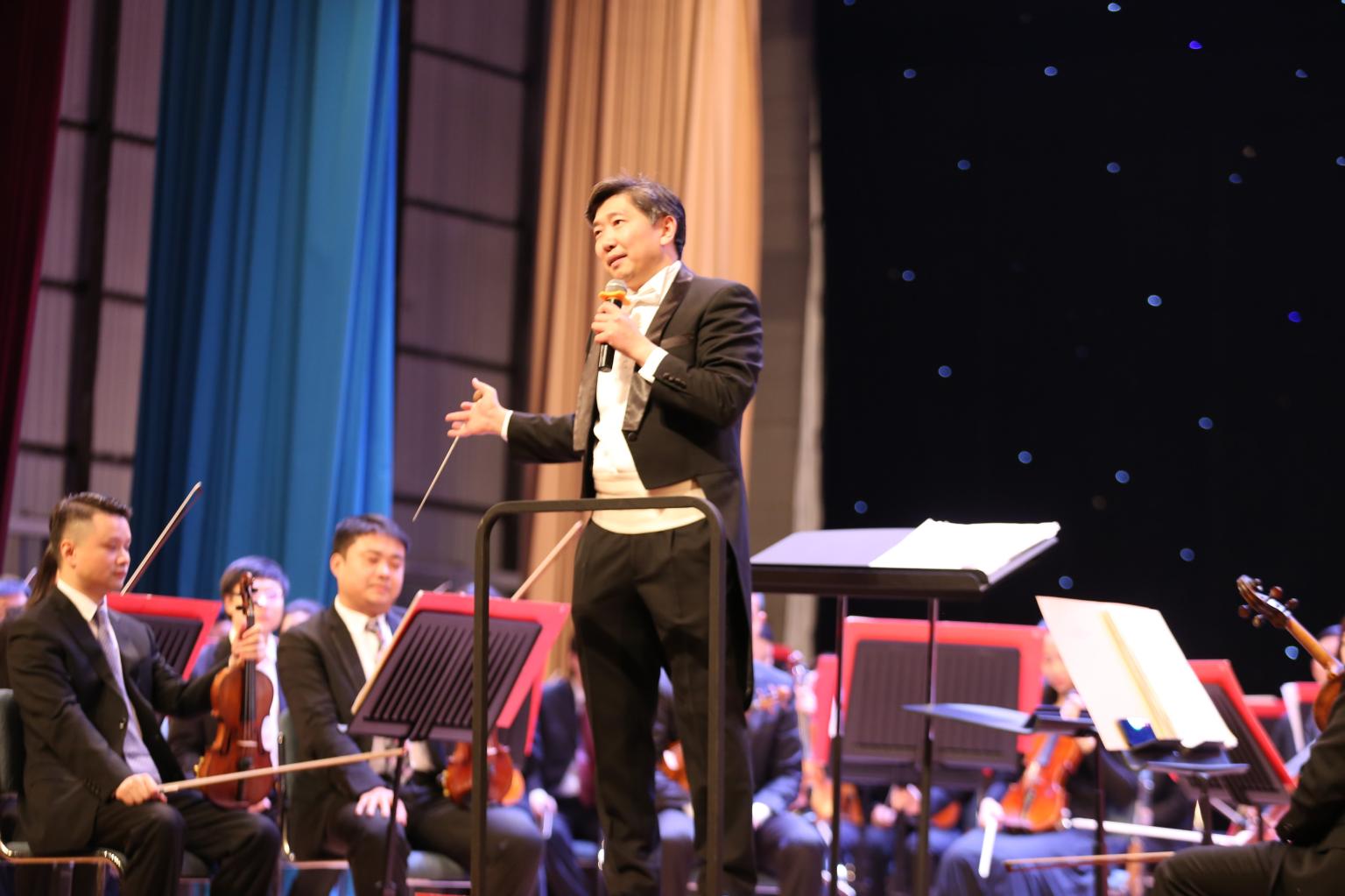 在热烈的掌声中,爱乐乐团常任指挥夏小汤重返舞台,再次献上《我的祖国》《激情燃烧的岁月》,表达对祖国深深的热爱与对法大青年学子的祝福。