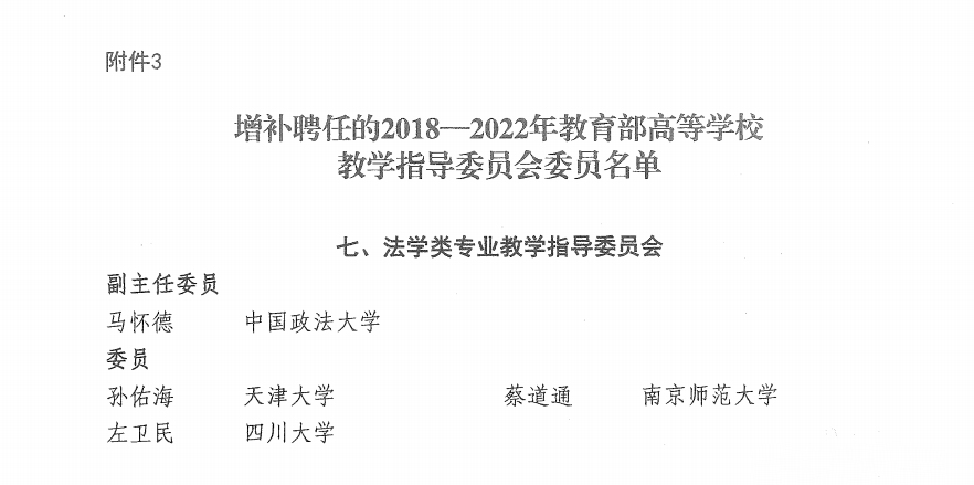 (特约记者 张鹏 王越驰)近日,教育部对2018-2022年教育部高等学校教学指导委员会进行了届中调整。我校校长马怀德教授被增补聘任为2018-2022年教育部高等学校法学类专业教学指导委员会副主任委员。天津大学法学院院长孙佑海教授、南京师范大学法学院院长蔡道通教授、四川大学法学院院长左卫民教授被增补聘任为法学类专业教学指导委员会委员。