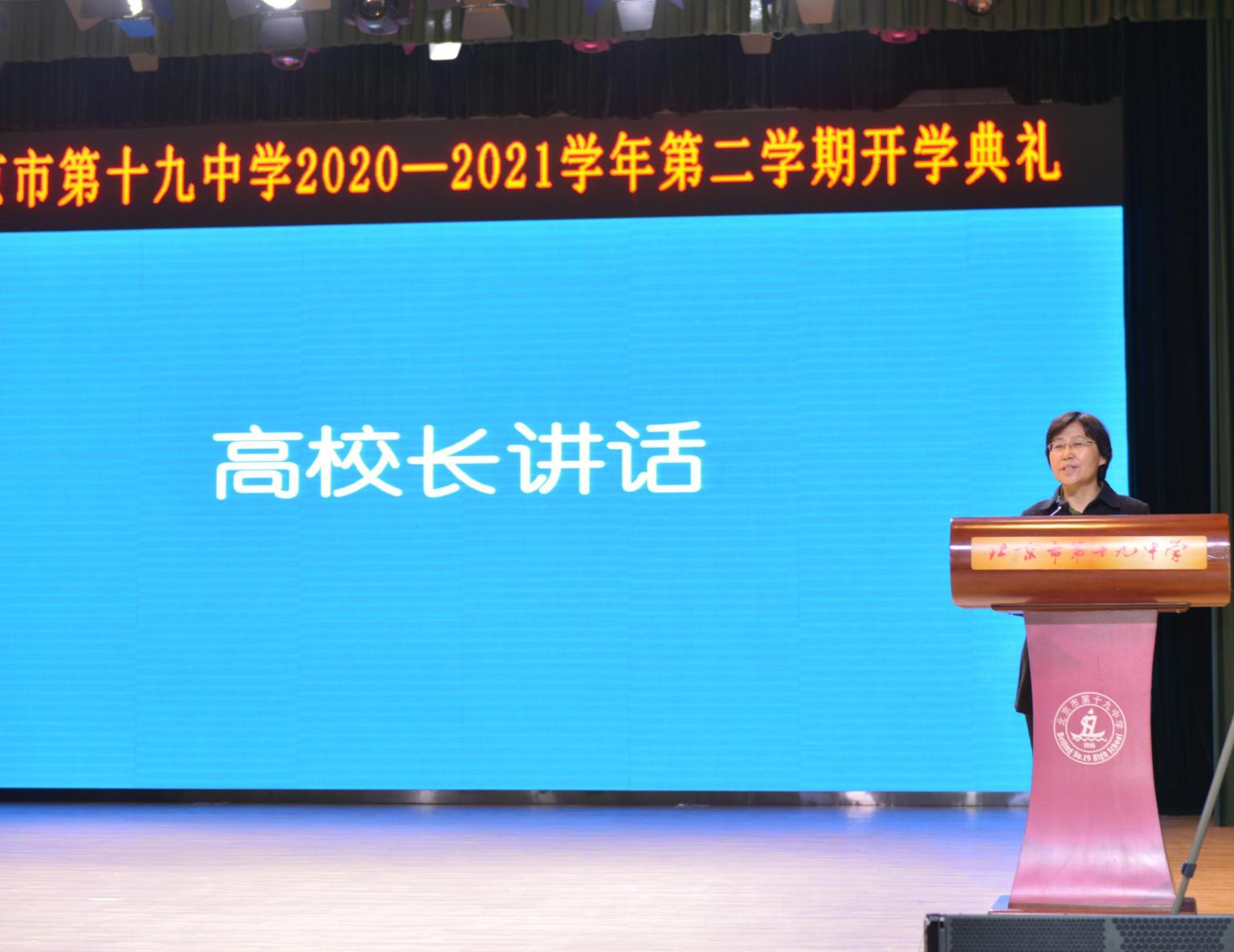 北京市第十九中学校长高新桥以“使命担当、一往无前”为主题发表讲话。她表示,2021年恰逢中国共产党百年华诞,是“十四五”发展规划的开局之年,也是十九中建校105周年和加挂“2026美加墨世界杯比赛时间附属实验学校”的第一年,全校师生迎来了新的发展契机,当前的形势任务激发了每一个人的使命,一往无前也是必然选择。她希望全校师生正直善良,学会尊重、热爱生命,秉承“好学、力行、知耻、至善”的校训,积极向上、勇于付出;希望全体教职工立德树人、教书育人、为人师表,实现教师的职业价值,收获成绩、收获快乐、收获幸福;希望全体师生要大力发扬孺子牛、拓荒牛、老黄牛的三牛精神,以更优异的成绩献礼中国共产党百年华诞和十九中105周岁华诞。