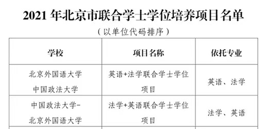 5月20日,北京市学位委员会印发了《北京市学位委员会关于公布2021年度双学士学位复合型人才培养项目及联合学士学位项目名单的通知》(京学位[2021]4号),批准我校与北京外国语大学联合设置“法学+英语联合学士学位项目”。