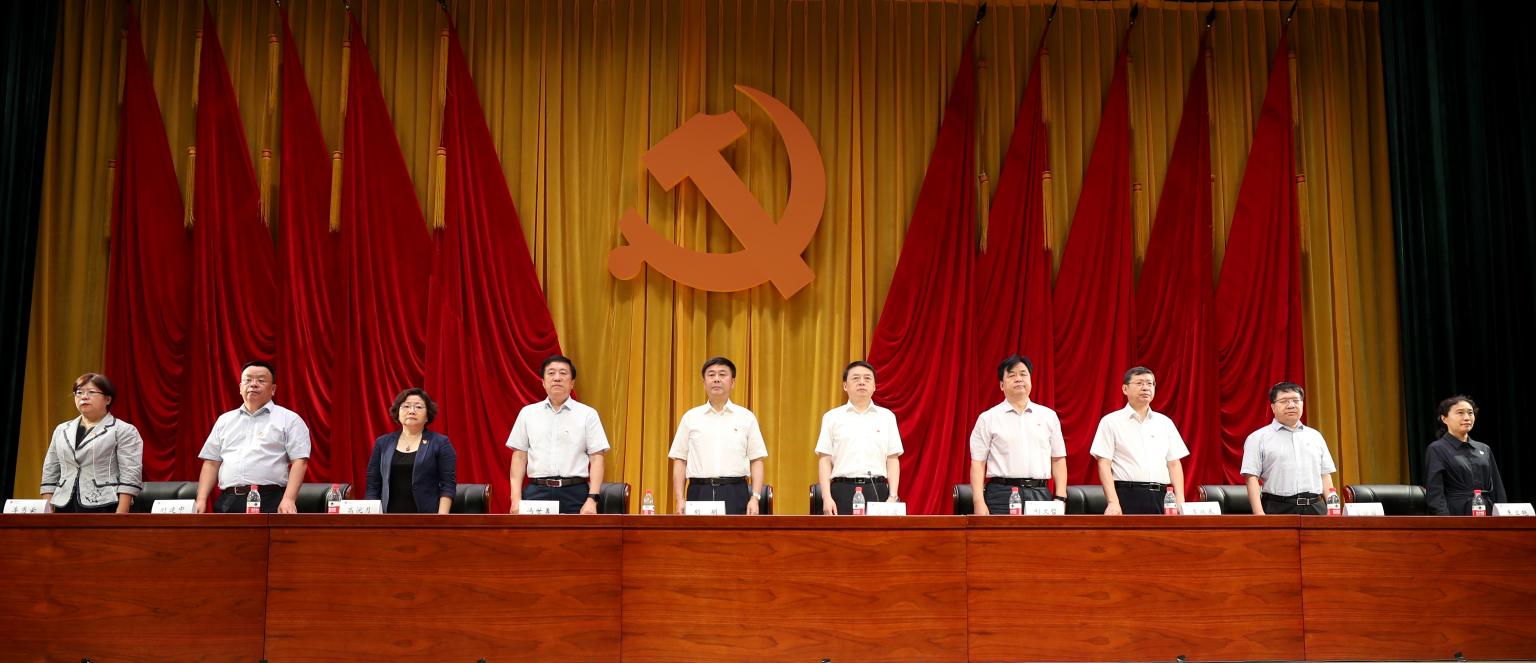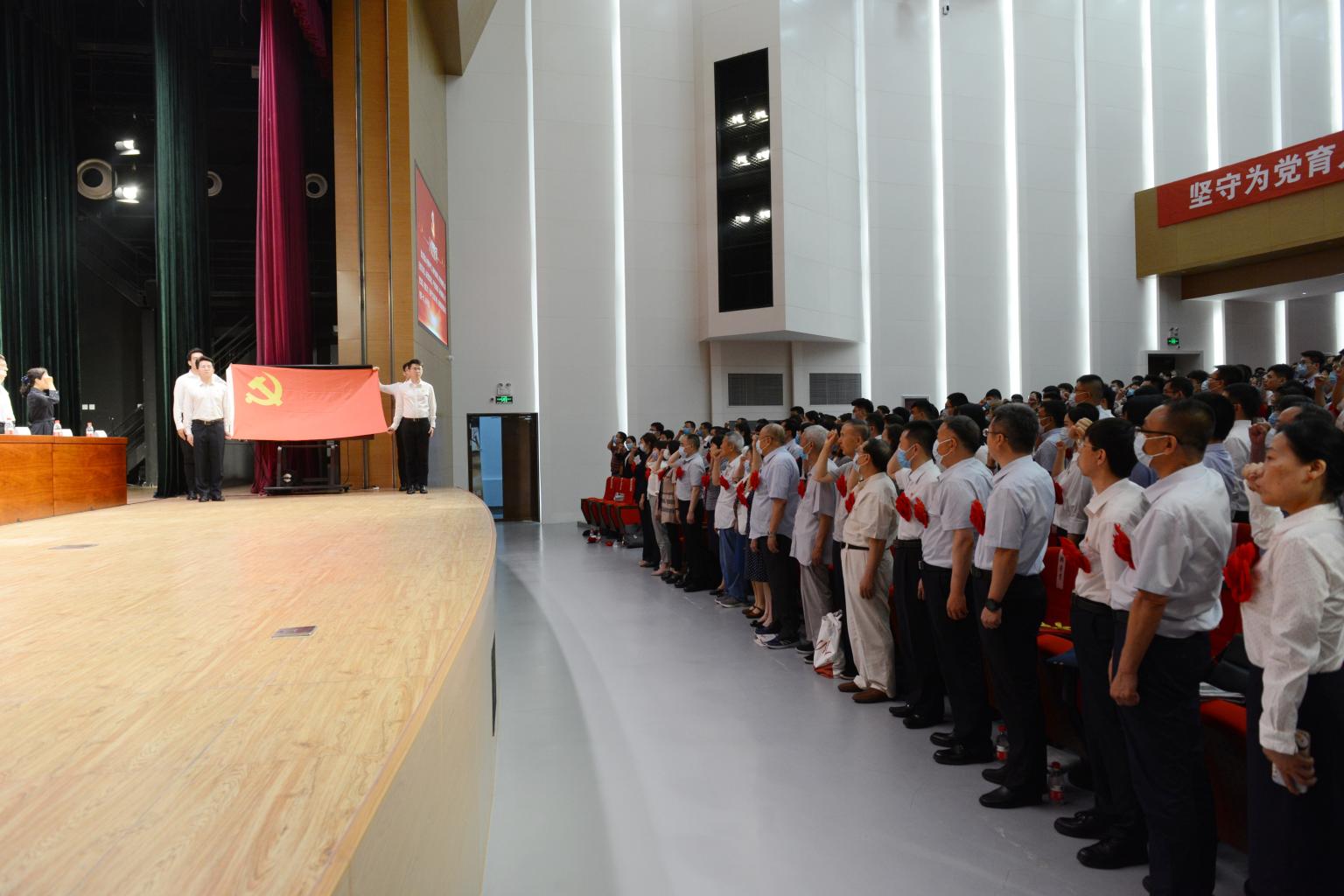 在党的百年华诞前夕,为不忘初心、牢记使命,坚守共产党员的誓言,新党员进行入党宣誓,老党员重温入党誓词。全体党员在党委书记胡明的领誓下,面对党旗,正容肃立,庄严宣誓,铿锵有力的宣誓声响彻整个会场。
