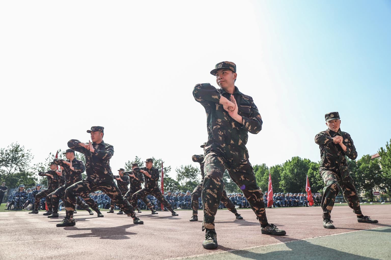 教官队列向军训团成员示范本次军训的训练项目军体拳和擒拿术,个个英姿飒爽。教官们以自身为表率,展现了作为一名军人所必备的血性与刚强。
