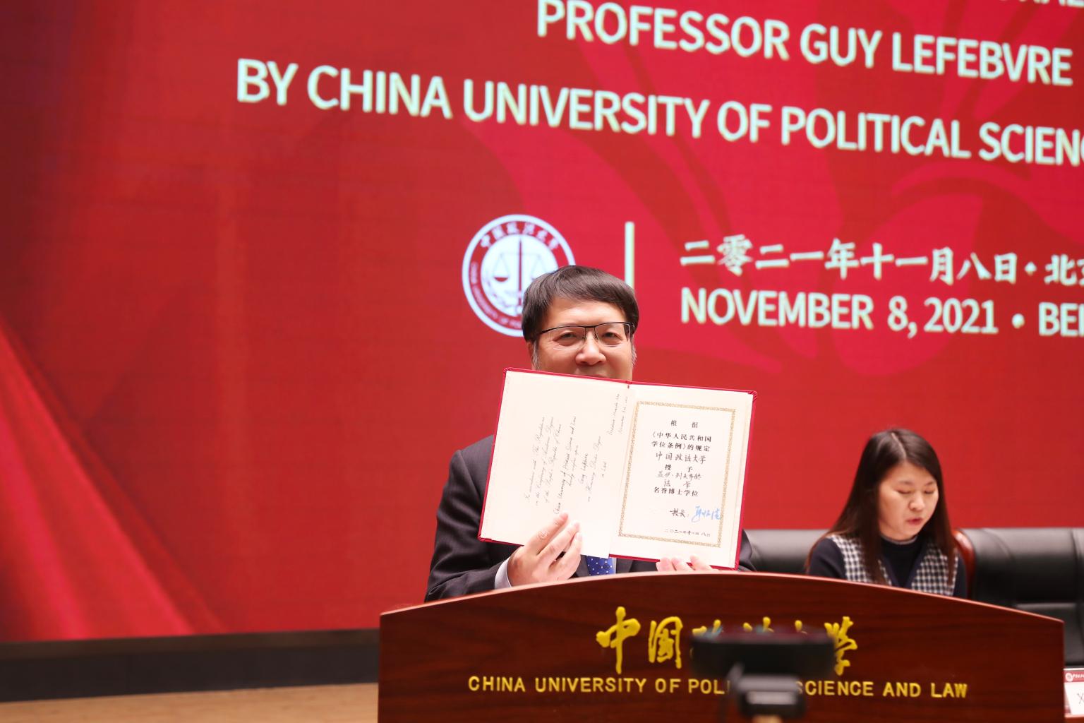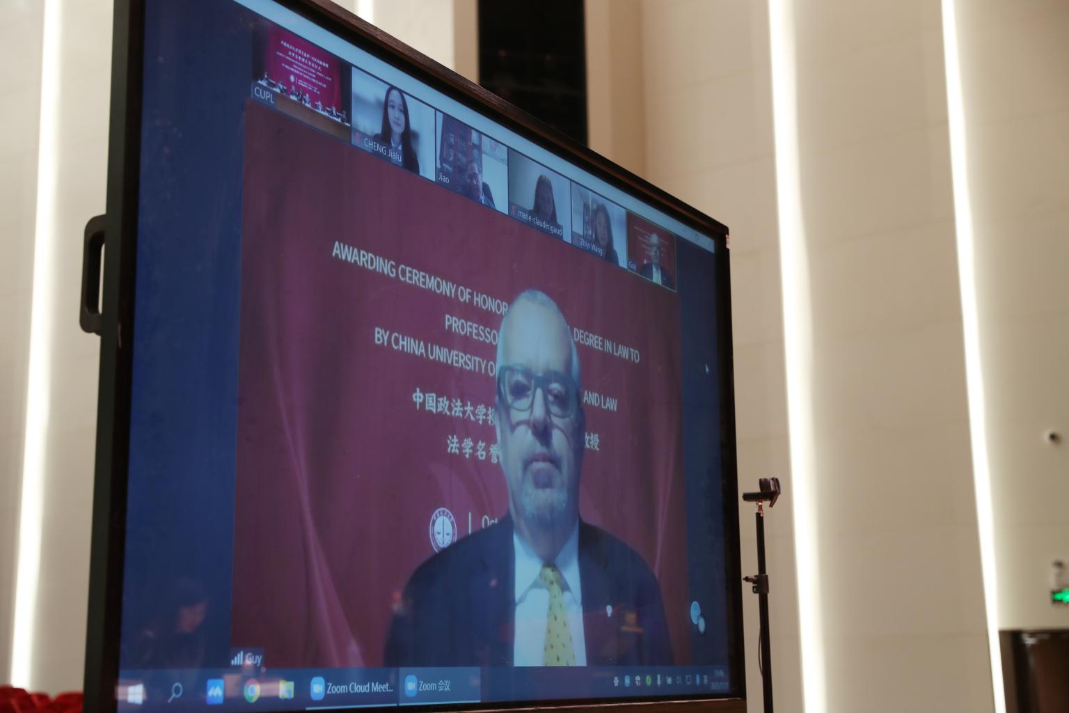 11月8日晚学院路校区礼堂,我校授予加拿大蒙特利尔大学荣誉教授、前副校长盖伊·列夫布赫(Guy Lefebvre)先生法学名誉博士学位在线仪式隆重举行。列夫布赫、加拿大魁北克省高等法院大法官玛丽克劳·里戈(Marie-Claude Rigaud)女士,我校校长马怀德、副校长时建中、副校长常保国等出席仪式,仪式由时建中主持。