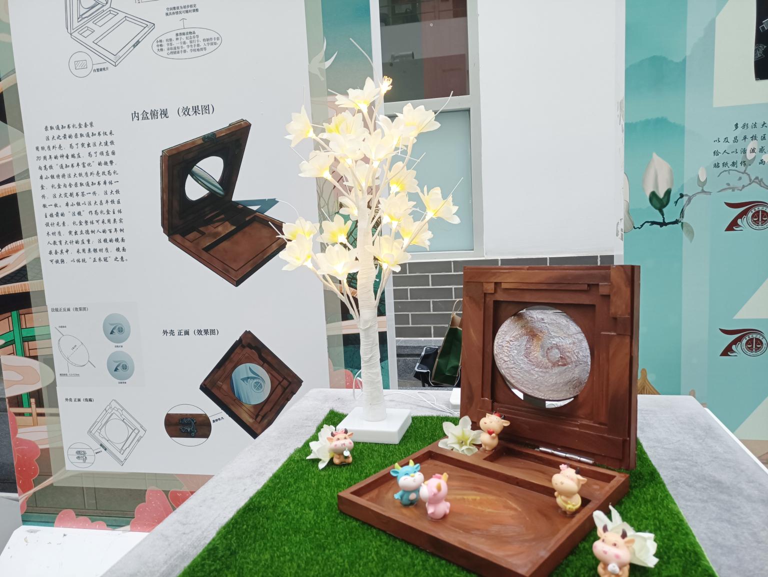 本次展览是一个有故事、有温度的展览。展品很多都有法大元素,体现了法大的历史,寄托了师生们对法大的情感,更是师生表现法大凝聚力的实物体现。展览共展出了70件展品,每一件展品都是表达设计者故事的讲述者,讲述它们背后所蕴含的设计故事与精神内涵,如“润玉·启明”作品以校花玉兰花表达“恩情、温情、真情”,讲述了70载法大对学子有温度的关怀与滋养,以及法大学子对母校真挚的感恩之情;“法大印象”作品以新生视角,将小而美的法大昌平校园浓缩在一个徽章之中,将法大最具标志性的象征汇集于一体,承载着新生对学校的崇敬之情。