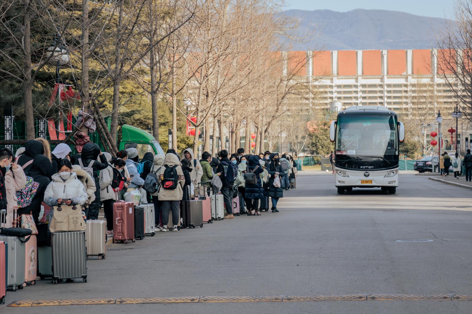 1月7日12:00、18:00及8日8:00、12:00、18:00,我校送站车准时出发,免费将前往北京站、北京西站和北京南站的学生送至对应站点。在出发时间前,校车站点前已排起了由带着行李的同学们组成的长队。“今年的人数较往年增加了许多,我们车队也是一直随时待命着,确保把每一位等车的同学都送到站点。”负责调度的车队姜文才老师介绍道。校车临出发前,司机们都帮同学们把行李放置到对应的车辆上,提醒同学们带好随身物品。当意识到车辆不够时,姜老师又迅速联系校车队提供备用的车辆,让每一位同学都能坐上学校的“暖心车辆”。在确保现场同学均找到座位后,一辆辆校车满载着归家的游子,准时向各个站点出发。