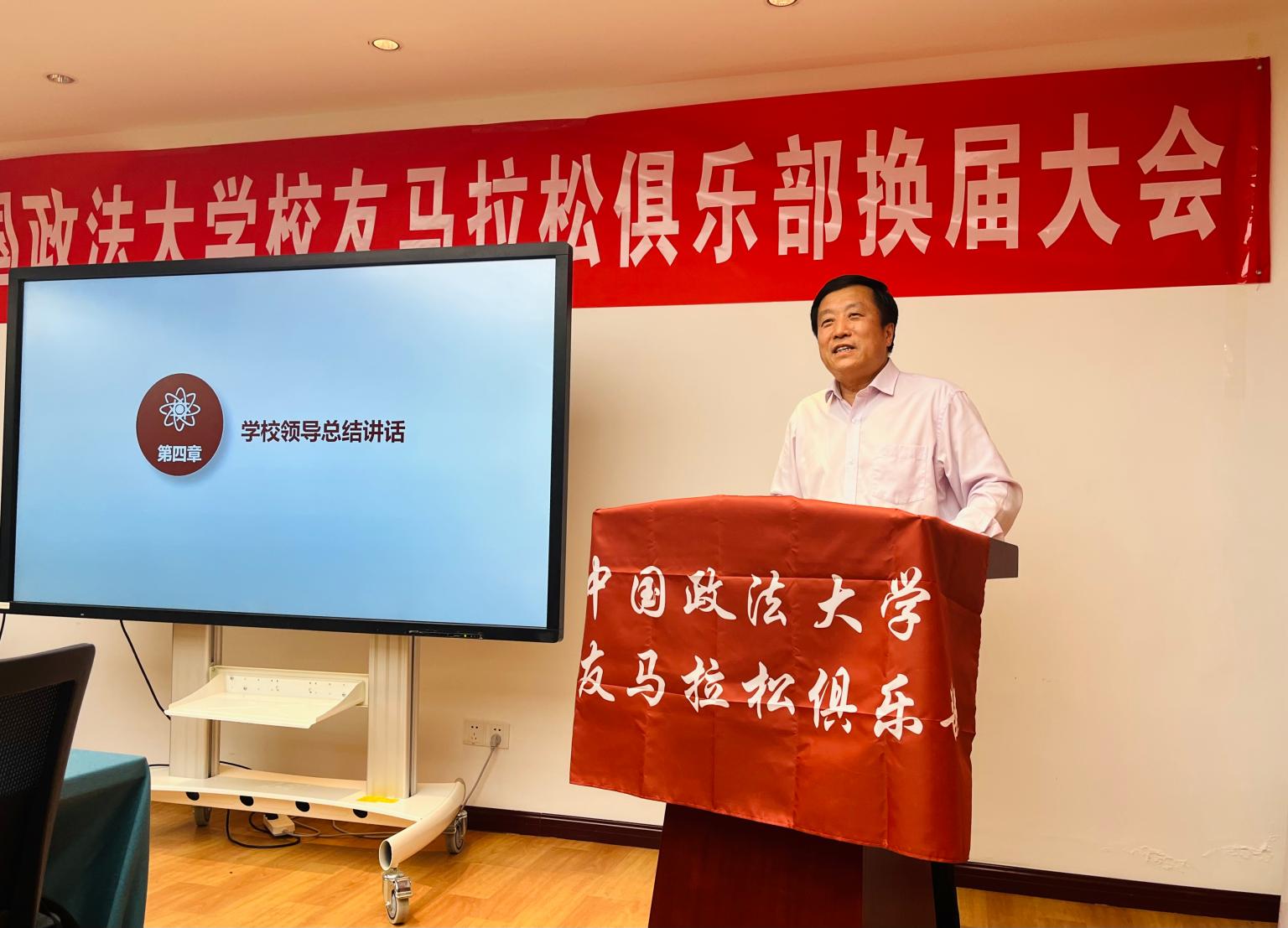 冯世勇代表学校、校友总会及学校体育运动委员会对法马俱乐部换届表示祝贺,对傅元主席及曾任执委会委员表示感谢,对新任执委会表示祝贺。他指出,马拉松的精神在于挑战自我、超越极限、坚忍不拔、永不放弃。作为最早的奥林匹克运动之一,也是运动育人的核心运动之一,马拉松影响力在国内外逐年提升。他充分肯定了首届法马俱乐部在傅元主席领导下所做的工作。针对学校体育运动,他指出,学校高度重视体育运动, 2018年正式举行第一届法大人马拉松比赛,至今已举办3届。马拉松不仅强健身体,磨练意志,塑造品质,减轻压力,增进师生之间、校友之间、学校与校友之间的情谊,同时培养法大情怀,增强法大人的向心力和凝聚力。最后,他提出四点希望:一是加强宣传。对法马俱乐部、马拉松活动及科学训练进行重点宣传;二是扩充组织。要适度降低门槛,调动在校师生的积极性与参与度;三是分享经验。努力挖掘并传播法大人的马拉松故事;四是开拓创新。希望法马俱乐部在学校体育运动中竖起独特旗帜,带动师生参与此项活动,在学校立德树人、培养德智体美劳全面发展的社会主义建设者和接班人的过程中做出应有贡献。