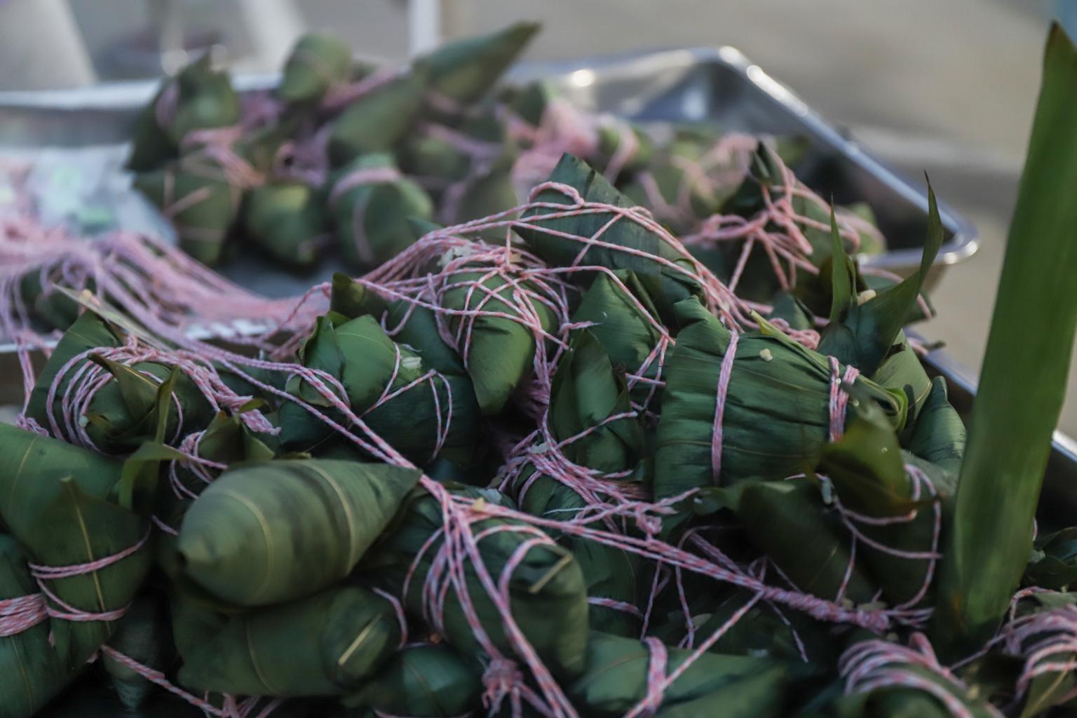 (后勤人员帮助同学包粽子 摄影 郭宏政)