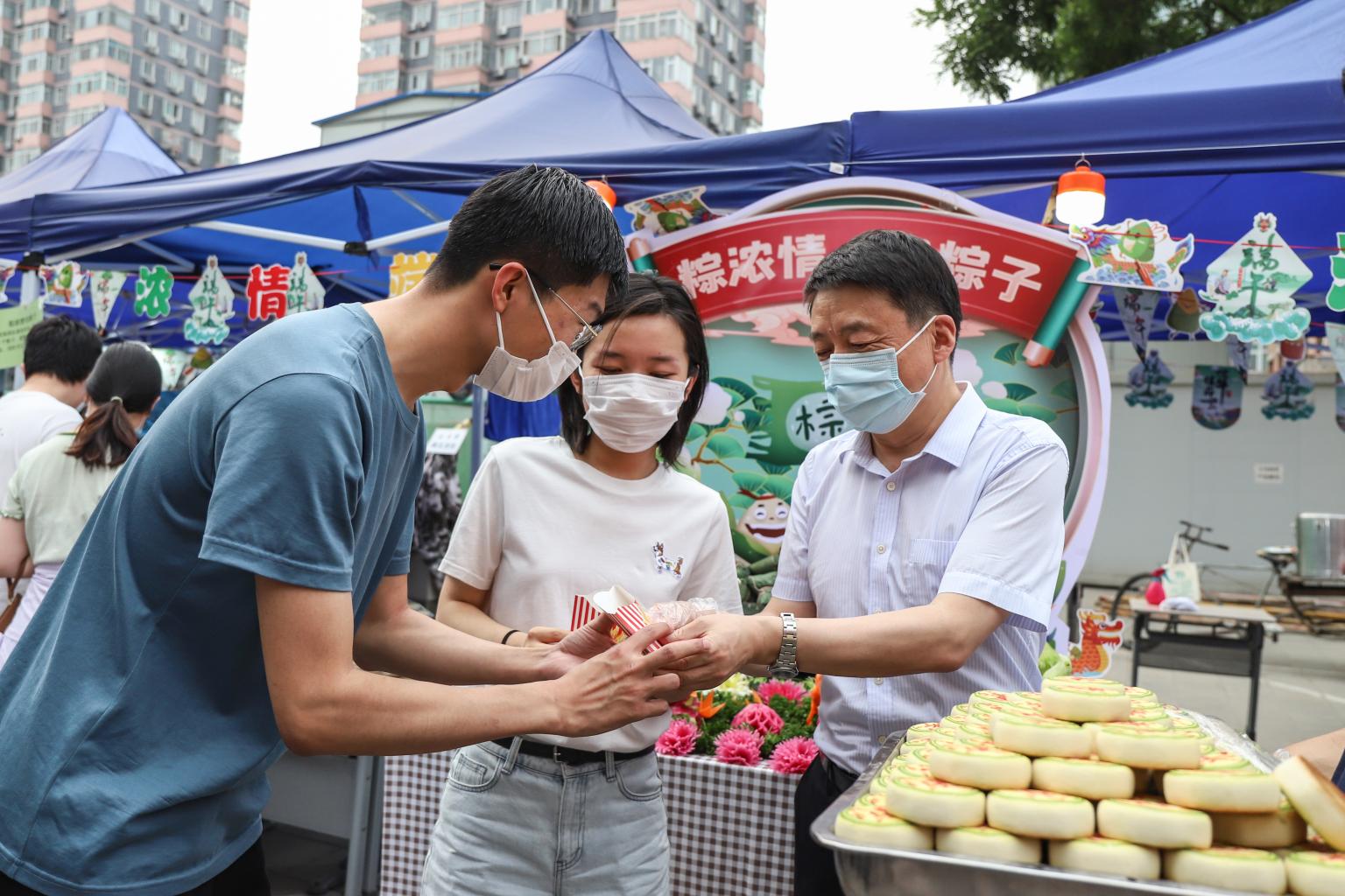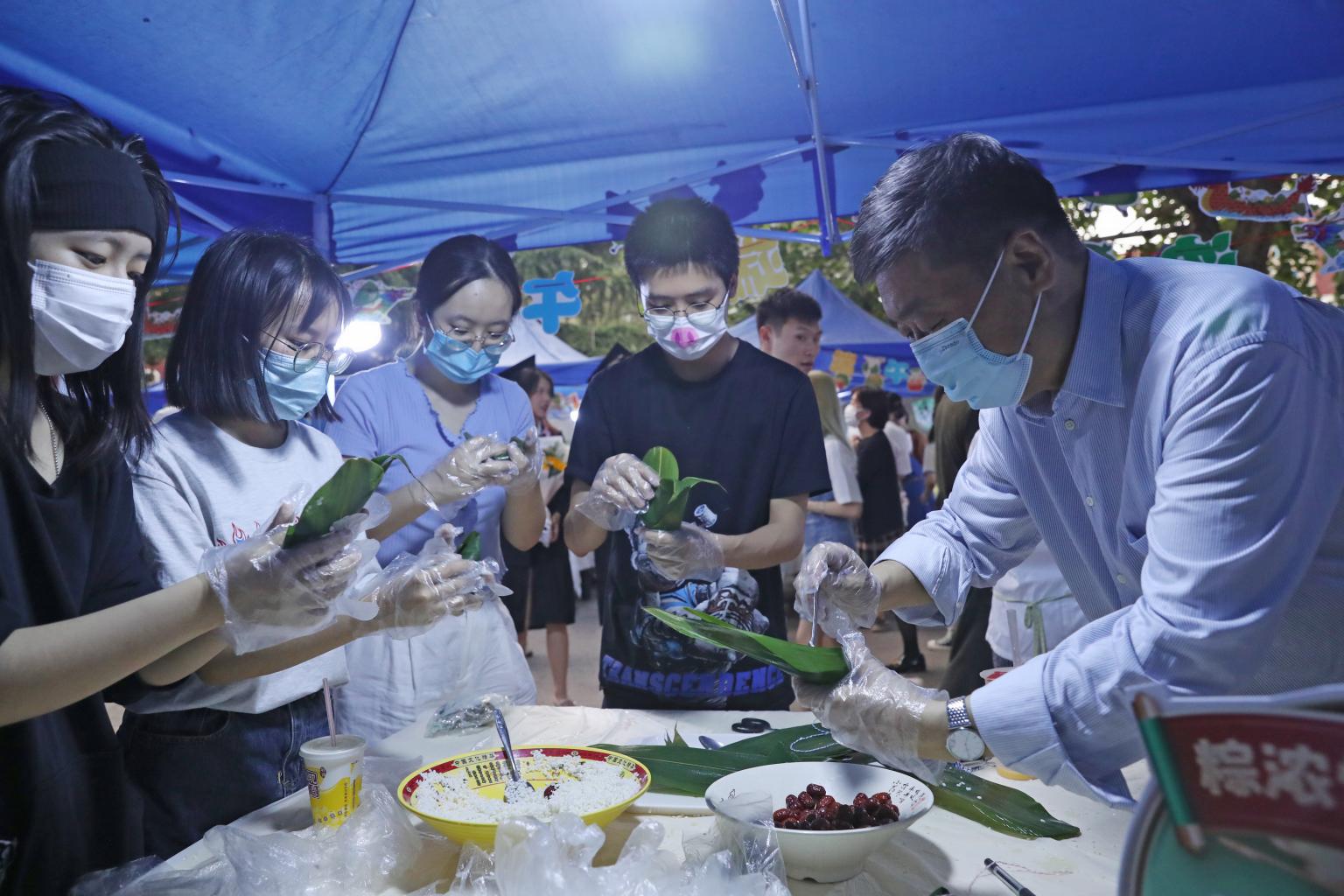 海淀校区同样弥漫着热闹的气氛。马怀德在活动现场向同学们送上真挚的节日祝福,并给现场同学发安康饼。除了与同学们一起体验包粽子,马怀德还在晚上22:00到活动现场看粽子出锅,与同学们共享品尝亲手包的粽子的喜悦。