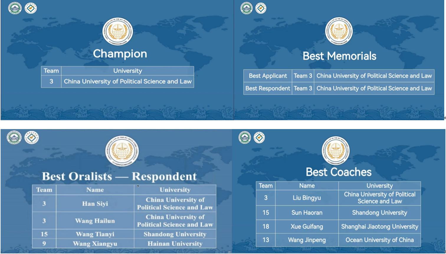 经过两天的激烈角逐,我校代表队获得本届竞赛的全国冠军,并包揽包括申请方最佳诉状、答辩方最佳诉状、最佳辩手以及最佳教练奖在内的所有单项奖,取得我校自参加这一高水平英文模拟法庭竞赛以来的历史最佳成绩。