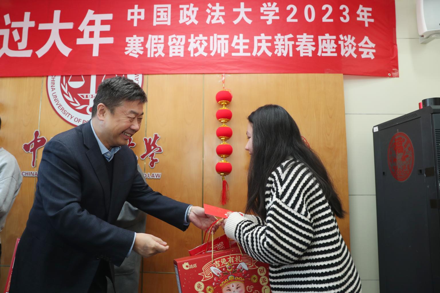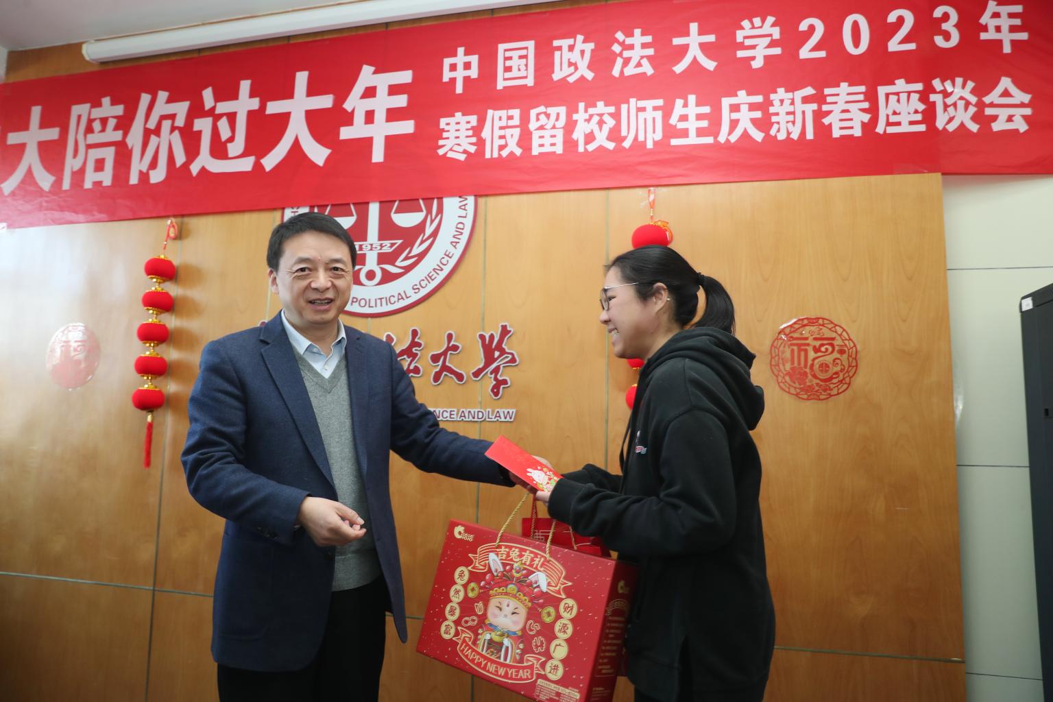胡明、马怀德为同学们发放“暖心大礼包”。大礼包里有法大定制窗花剪纸、春联、兔年毛绒吉祥物、干果零食等物品和春节补助。